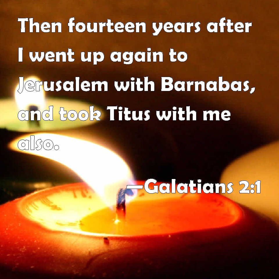 Choose a Background Galatians 2:1 Then fourteen years after I went up again to Jerusalem with Barnabas, and took Titus with me also. KJV: Then fourteen years after I went up again to Jerusalem with Barnabas, and took Titus with me also. DRB: Then, after fourteen years, I went up again to Jerusalem with Barnabas, taking Titus also with me. DBT: Then after a lapse of fourteen years I went up again to Jerusalem with Barnabas, taking Titus also with me; ERV: Then after the space of fourteen years I went up again to Jerusalem with Barnabas, taking Titus also with me. WBT: Then fourteen years after I went again to Jerusalem with Barnabas, and took Titus with me also. WEB: Then after a period of fourteen years I went up again to Jerusalem with Barnabas, taking Titus also with me. YLT: Then, after fourteen years again I went up to Jerusalem with Barnabas, having taken with me also Titus;Links Galatians 2:1 NIV • Galatians 2:1 NLT • Galatians 2:1 ESV • Galatians 2:1 NASB • Galatians 2:1 KJV • Galatians 2:1 Interlinear • Galatians 2:1 Commentaries • Galatians 2:1 Parallel Texts • Galatians 2:1 Bible Apps • Galatians 2:1 Parallel • Bible Hub |