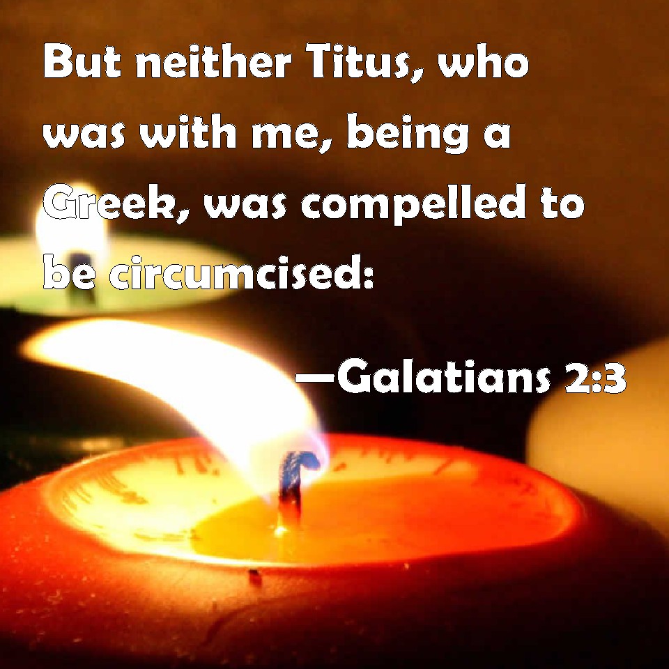 Choose a Background Galatians 2:3 But neither Titus, who was with me, being a Greek, was compelled to be circumcised: KJV: But neither Titus, who was with me, being a Greek, was compelled to be circumcised: DRB: But neither Titus, who was with me, being a Gentile, was compelled to be circumcised. DBT: (but neither was Titus, who was with me, being a Greek, compelled to be circumcised;) ERV: But not even Titus who was with me, being a Greek, was compelled to be circumcised: WBT: But neither Titus, who was with me, being a Greek, was compelled to be circumcised: WEB: But not even Titus, who was with me, being a Greek, was compelled to be circumcised. YLT: but not even Titus, who is with me, being a Greek, was compelled to be circumcised — Links Galatians 2:3 NIV • Galatians 2:3 NLT • Galatians 2:3 ESV • Galatians 2:3 NASB • Galatians 2:3 KJV • Galatians 2:3 Interlinear • Galatians 2:3 Commentaries • Galatians 2:3 Parallel Texts • Galatians 2:3 Bible Apps • Galatians 2:3 Parallel • Bible Hub |