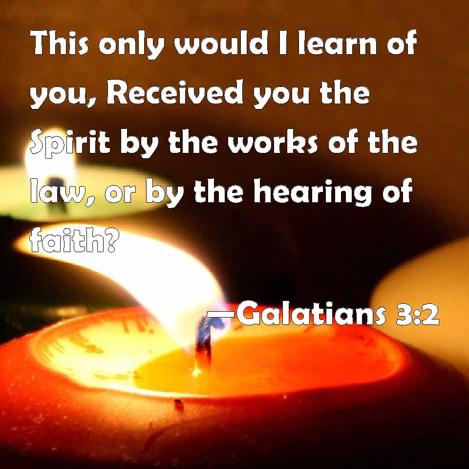 Choose a Background Galatians 3:2 This only would I learn of you, Received you the Spirit by the works of the law, or by the hearing of faith? KJV: This only would I learn of you, Received ye the Spirit by the works of the law, or by the hearing of faith? DRB: This only would I learn of you: Did you receive the Spirit by the works of the law, or by the hearing of faith? DBT: This only I wish to learn of you, Have ye received the Spirit on the principle of works of law, or of the report of faith? ERV: This only would I learn from you, Received ye the Spirit by the works of the law, or by the hearing of faith? WBT: This only would I learn from you, Received ye the Spirit by the works of the law, or by the hearing of faith? WEB: I just want to learn this from you. Did you receive the Spirit by the works of the law, or by hearing of faith? YLT: this only do I wish to learn from you — by works of law the Spirit did ye receive, or by the hearing of faith?Links Galatians 3:2 NIV • Galatians 3:2 NLT • Galatians 3:2 ESV • Galatians 3:2 NASB • Galatians 3:2 KJV • Galatians 3:2 Interlinear • Galatians 3:2 Commentaries • Galatians 3:2 Parallel Texts • Galatians 3:2 Bible Apps • Galatians 3:2 Parallel • Bible Hub |