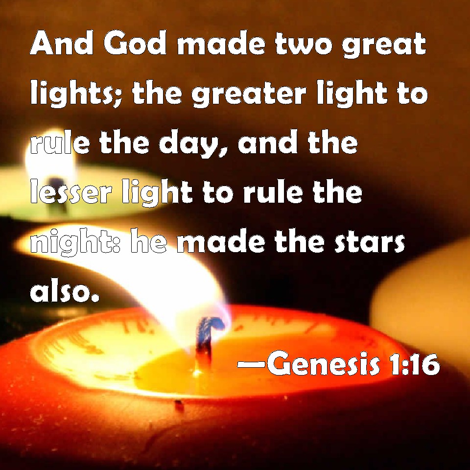 Choose a Background Genesis 1:16 And God made two great lights; the greater light to rule the day, and the lesser light to rule the night: he made the stars also. KJV: And God made two great lights; the greater light to rule the day, and the lesser light to rule the night: he made the stars also. DRB: And God made two great lights: a greater light to rule the day; and a lesser light to rule the night: and the stars. DBT: And God made the two great lights, the great light to rule the day, and the small light to rule the night, and the stars. ERV: And God made the two great lights; the greater light to rule the day, and the lesser light to rule the night: he made the stars also. WBT: And God made two great lights; the greater light to rule the day, and the lesser light to rule the night: he made the stars also. WEB: God made the two great lights: the greater light to rule the day, and the lesser light to rule the night. He also made the stars. YLT: And God maketh the two great luminaries, the great luminary for the rule of the day, and the small luminary — and the stars — for the rule of the night;Links Genesis 1:16 NIV • Genesis 1:16 NLT • Genesis 1:16 ESV • Genesis 1:16 NASB • Genesis 1:16 KJV • Genesis 1:16 Interlinear • Genesis 1:16 Commentaries • Genesis 1:16 Parallel Texts • Genesis 1:16 Bible Apps • Genesis 1:16 Parallel • Bible Hub |