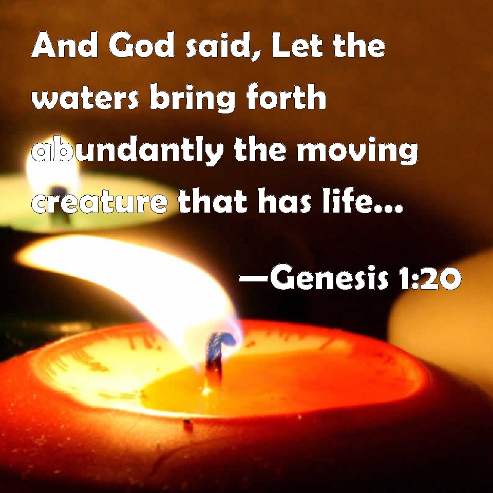 Choose a Background Genesis 1:20 And God said, Let the waters bring forth abundantly the moving creature that has life, and fowl that may fly above the earth in the open firmament of heaven. KJV: And God said, Let the waters bring forth abundantly the moving creature that hath life, and fowl that may fly above the earth in the open firmament of heaven. DRB: God also said: Let the waters bring forth the creeping creature having life, and the fowl that may fly over the earth under the firmament of heaven. DBT: And God said, Let the waters swarm with swarms of living souls, and let fowl fly above the earth in the expanse of the heavens. ERV: And God said, Let the waters bring forth abundantly the moving creature that hath life, and let fowl fly above the earth in the open firmament of heaven. WBT: And God said, Let the waters bring forth abundantly the moving creature that hath life, and fowl that may fly above the earth in the open firmament of heaven. WEB: God said, "Let the waters swarm with swarms of living creatures, and let birds fly above the earth in the open expanse of sky." YLT: And God saith, 'Let the waters teem with the teeming living creature, and fowl let fly on the earth on the face of the expanse of the heavens.'Links Genesis 1:20 NIV • Genesis 1:20 NLT • Genesis 1:20 ESV • Genesis 1:20 NASB • Genesis 1:20 KJV • Genesis 1:20 Interlinear • Genesis 1:20 Commentaries • Genesis 1:20 Parallel Texts • Genesis 1:20 Bible Apps • Genesis 1:20 Parallel • Bible Hub |