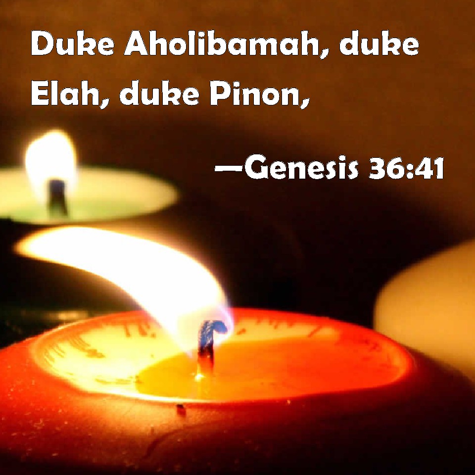 Choose a Background Genesis 36:41 Duke Aholibamah, duke Elah, duke Pinon, KJV: Duke Aholibamah, duke Elah, duke Pinon, DRB: Duke Oolibama, duke Ela, duke Phinon, DBT: chief Oholibamah, chief Elah, chief Pinon, ERV: duke Oholibamah, duke Elah, duke Pinon; WBT: Duke Aholibamah, duke Elah, duke Pinon, WEB: chief Oholibamah, chief Elah, chief Pinon, YLT: chief Aholibamah, chief Elah, chief Pinon,Links Genesis 36:41 NIV • Genesis 36:41 NLT • Genesis 36:41 ESV • Genesis 36:41 NASB • Genesis 36:41 KJV • Genesis 36:41 Interlinear • Genesis 36:41 Commentaries • Genesis 36:41 Parallel Texts • Genesis 36:41 Bible Apps • Genesis 36:41 Parallel • Bible Hub |