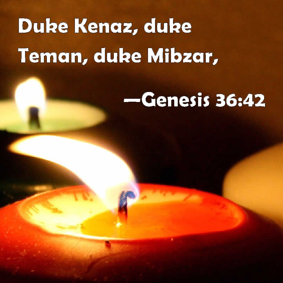 Choose a Background Genesis 36:42 Duke Kenaz, duke Teman, duke Mibzar, KJV: Duke Kenaz, duke Teman, duke Mibzar, DRB: Duke Cenez, duke Theman, duke Mabsar, DBT: chief Kenaz, chief Teman, chief Mibzar, ERV: duke Kenaz, duke Teman, duke Mibzar; WBT: Duke Kenaz, duke Teman, duke Mibzar. WEB: chief Kenaz, chief Teman, chief Mibzar, YLT: chief Kenaz, chief Teman, chief Mibzar,Links Genesis 36:42 NIV • Genesis 36:42 NLT • Genesis 36:42 ESV • Genesis 36:42 NASB • Genesis 36:42 KJV • Genesis 36:42 Interlinear • Genesis 36:42 Commentaries • Genesis 36:42 Parallel Texts • Genesis 36:42 Bible Apps • Genesis 36:42 Parallel • Bible Hub |