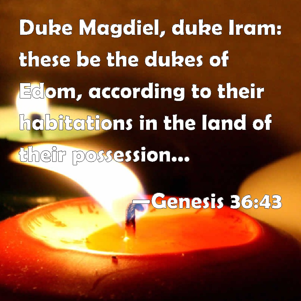 Choose a Background Genesis 36:43 Duke Magdiel, duke Iram: these be the dukes of Edom, according to their habitations in the land of their possession: he is Esau the father of the Edomites. KJV: Duke Magdiel, duke Iram: these be the dukes of Edom, according to their habitations in the land of their possession: he is Esau the father of the Edomites. DRB: Duke Magdiel, duke Hiram: these are the dukes of Edom dwelling in the land of their government; the same is Esau the father of the Edomites. DBT: chief Magdiel, chief Iram. These are the chiefs of Edom, according to their dwelling-places in the land of their possession. This is Esau, the father of Edom. ERV: duke Magdiel, duke Iram: these be the dukes of Edom, according to their habitations in the land of their possession. This is Esau the father of the Edomites. WBT: Duke Magdiel, duke Iram; these are the dukes of Edom, according to their habitations, in the land of their possession: he is Esau the father of the Edomites. WEB: chief Magdiel, and chief Iram. These are the chiefs of Edom, according to their habitations in the land of their possession. This is Esau, the father of the Edomites. YLT: chief Magdiel, chief Iram: these are chiefs of Edom, in reference to their dwellings, in the land of their possession; he is Esau father of Edom.Links Genesis 36:43 NIV • Genesis 36:43 NLT • Genesis 36:43 ESV • Genesis 36:43 NASB • Genesis 36:43 KJV • Genesis 36:43 Interlinear • Genesis 36:43 Commentaries • Genesis 36:43 Parallel Texts • Genesis 36:43 Bible Apps • Genesis 36:43 Parallel • Bible Hub |