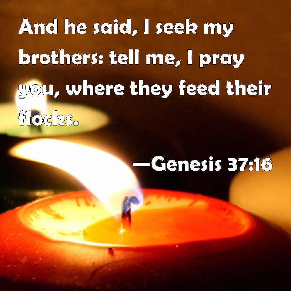 Choose a Background Genesis 37:16 And he said, I seek my brothers: tell me, I pray you, where they feed their flocks. KJV: And he said, I seek my brethren: tell me, I pray thee, where they feed their flocks. DRB: But he answered: I seek my brethren; tell me where they feed the docks. DBT: And he said, I am seeking my brethren: tell me, I pray thee, where they feed their flocks. ERV: And he said, I seek my brethren: tell me, I pray thee, where they are feeding the flock. WBT: And he said, I seek my brethren: tell me, I pray thee, where they feed their flocks. WEB: He said, "I am looking for my brothers. Tell me, please, where they are feeding the flock." YLT: and he saith, 'My brethren I am seeking, declare to me, I pray thee, where they are feeding?'Links Genesis 37:16 NIV • Genesis 37:16 NLT • Genesis 37:16 ESV • Genesis 37:16 NASB • Genesis 37:16 KJV • Genesis 37:16 Interlinear • Genesis 37:16 Commentaries • Genesis 37:16 Parallel Texts • Genesis 37:16 Bible Apps • Genesis 37:16 Parallel • Bible Hub |