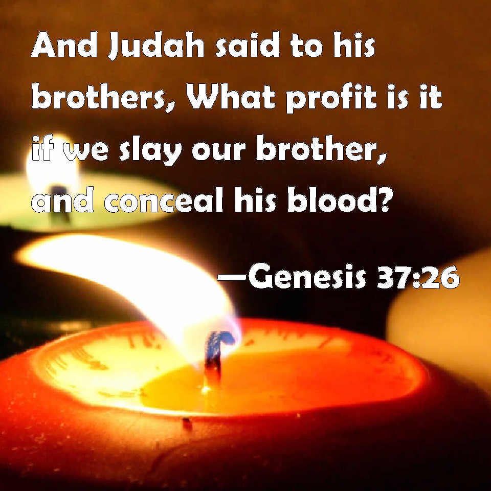 Choose a Background Genesis 37:26 And Judah said to his brothers, What profit is it if we slay our brother, and conceal his blood? KJV: And Judah said unto his brethren, What profit is it if we slay our brother, and conceal his blood? DRB: And Juda said to his brethren: What will it profit us to kill our brother, and conceal his blood? DBT: And Judah said to his brethren, What profit is it that we kill our brother and secrete his blood? ERV: And Judah said unto his brethren, What profit is it if we slay our brother and conceal his blood? WBT: And Judah said to his brethren, What profit is it if we slay our brother, and conceal his blood. WEB: Judah said to his brothers, "What profit is it if we kill our brother and conceal his blood? YLT: And Judah saith unto his brethren, 'What gain when we slay our brother, and have concealed his blood?Links Genesis 37:26 NIV • Genesis 37:26 NLT • Genesis 37:26 ESV • Genesis 37:26 NASB • Genesis 37:26 KJV • Genesis 37:26 Interlinear • Genesis 37:26 Commentaries • Genesis 37:26 Parallel Texts • Genesis 37:26 Bible Apps • Genesis 37:26 Parallel • Bible Hub |