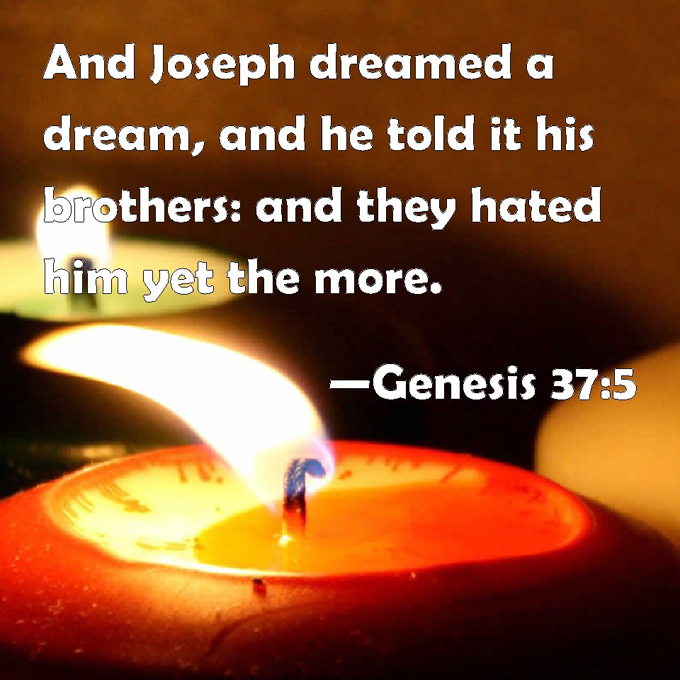 Choose a Background Genesis 37:5 And Joseph dreamed a dream, and he told it his brothers: and they hated him yet the more. KJV: And Joseph dreamed a dream, and he told it his brethren: and they hated him yet the more. DRB: Now it fell out also that he told his brethren a dream, that he had dreamed: which occasioned them to hate him the more. DBT: And Joseph dreamed a dream, and told it to his brethren, and they hated him yet the more. ERV: And Joseph dreamed a dream, and he told it to his brethren: and they hated him yet the more. WBT: And Joseph dreamed a dream, and he told it to his brethren: and they hated him yet the more. WEB: Joseph dreamed a dream, and he told it to his brothers, and they hated him all the more. YLT: And Joseph dreameth a dream, and declareth to his brethren, and they add still more to hate him.Links Genesis 37:5 NIV • Genesis 37:5 NLT • Genesis 37:5 ESV • Genesis 37:5 NASB • Genesis 37:5 KJV • Genesis 37:5 Interlinear • Genesis 37:5 Commentaries • Genesis 37:5 Parallel Texts • Genesis 37:5 Bible Apps • Genesis 37:5 Parallel • Bible Hub |