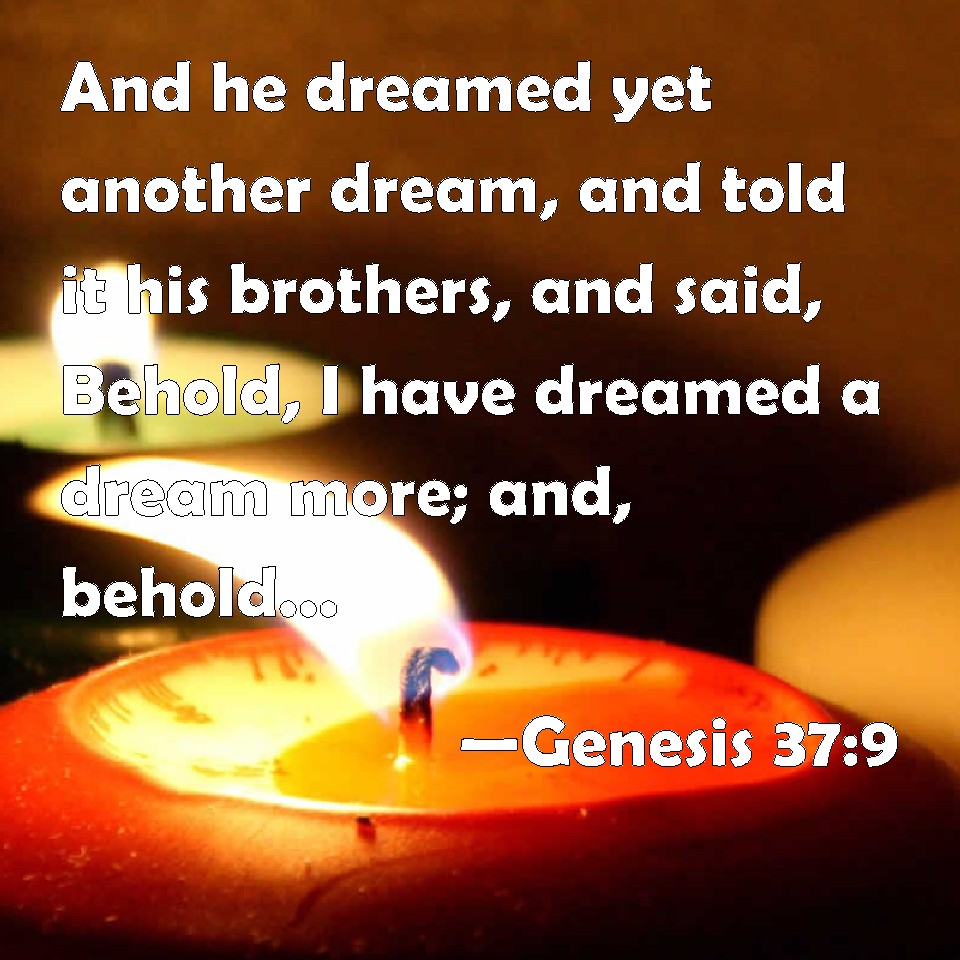 Choose a Background Genesis 37:9 And he dreamed yet another dream, and told it his brothers, and said, Behold, I have dreamed a dream more; and, behold, the sun and the moon and the eleven stars made obeisance to me. KJV: And he dreamed yet another dream, and told it his brethren, and said, Behold, I have dreamed a dream more; and, behold, the sun and the moon and the eleven stars made obeisance to me. DRB: He dreamed also another dream, which he told his brethren, saying: I saw in a dream, as it were the sun, and the moon, and eleven stars worshipping me. DBT: And he dreamed yet another dream, and told it to his brethren, and said, Behold, I have dreamt another dream, and behold, the sun and the moon and eleven stars bowed down to me. ERV: And he dreamed yet another dream, and told it to his brethren, and said, Behold, I have dreamed yet a dream; and, behold, the sun and the moon and eleven stars made obeisance to me. WBT: And he dreamed yet another dream, and told it to his brethren, and said, Behold, I have dreamed a dream more: and behold, the sun and the moon and the eleven stars made obeisance to me. WEB: He dreamed yet another dream, and told it to his brothers, and said, "Behold, I have dreamed yet another dream: and behold, the sun and the moon and eleven stars bowed down to me." YLT: And he dreameth yet another dream, and recounteth it to his brethren, and saith, 'Lo, I have dreamed a dream again, and lo, the sun and the moon, and eleven stars, are bowing themselves to me.'Links Genesis 37:9 NIV • Genesis 37:9 NLT • Genesis 37:9 ESV • Genesis 37:9 NASB • Genesis 37:9 KJV • Genesis 37:9 Interlinear • Genesis 37:9 Commentaries • Genesis 37:9 Parallel Texts • Genesis 37:9 Bible Apps • Genesis 37:9 Parallel • Bible Hub |