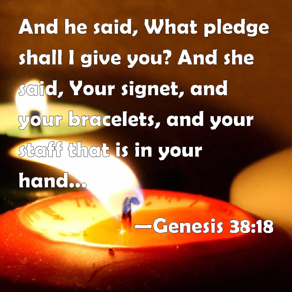 Choose a Background Genesis 38:18 And he said, What pledge shall I give you? And she said, Your signet, and your bracelets, and your staff that is in your hand. And he gave it her, and came in to her, and she conceived by him. KJV: And he said, What pledge shall I give thee? And she said, Thy signet, and thy bracelets, and thy staff that is in thine hand. And he gave it her, and came in unto her, and she conceived by him. DRB: Juda said: What wilt thou have for a pledge ? She answered: Thy ring and bracelet, and the staff which thou holdest in thy hand. The woman therefore at one copulation conceived. DBT: And he said, What pledge shall I give thee? And she said, Thy signet, and thy lace, and thy staff which is in thy hand. And he gave it her, and went in to her; and she conceived by him. ERV: And he said, What pledge shall I give thee? And she said, Thy signet and thy cord, and thy staff that is in thine hand. And he gave them to her, and came in unto her, and she conceived by him. WBT: And he said, What pledge shall I give thee? and she said, Thy signet, and thy bracelets, and thy staff that is in thy hand: and he gave them to her, and came in to her, and she conceived by him. WEB: He said, "What pledge will I give you?" She said, "Your signet and your cord, and your staff that is in your hand." He gave them to her, and came in to her, and she conceived by him. YLT: and he saith, 'What is the pledge that I give to thee?' and she saith, 'Thy seal, and thy ribbon, and thy staff which is in thy hand;' and he giveth to her, and goeth in unto her, and she conceiveth to him;Links Genesis 38:18 NIV • Genesis 38:18 NLT • Genesis 38:18 ESV • Genesis 38:18 NASB • Genesis 38:18 KJV • Genesis 38:18 Interlinear • Genesis 38:18 Commentaries • Genesis 38:18 Parallel Texts • Genesis 38:18 Bible Apps • Genesis 38:18 Parallel • Bible Hub |