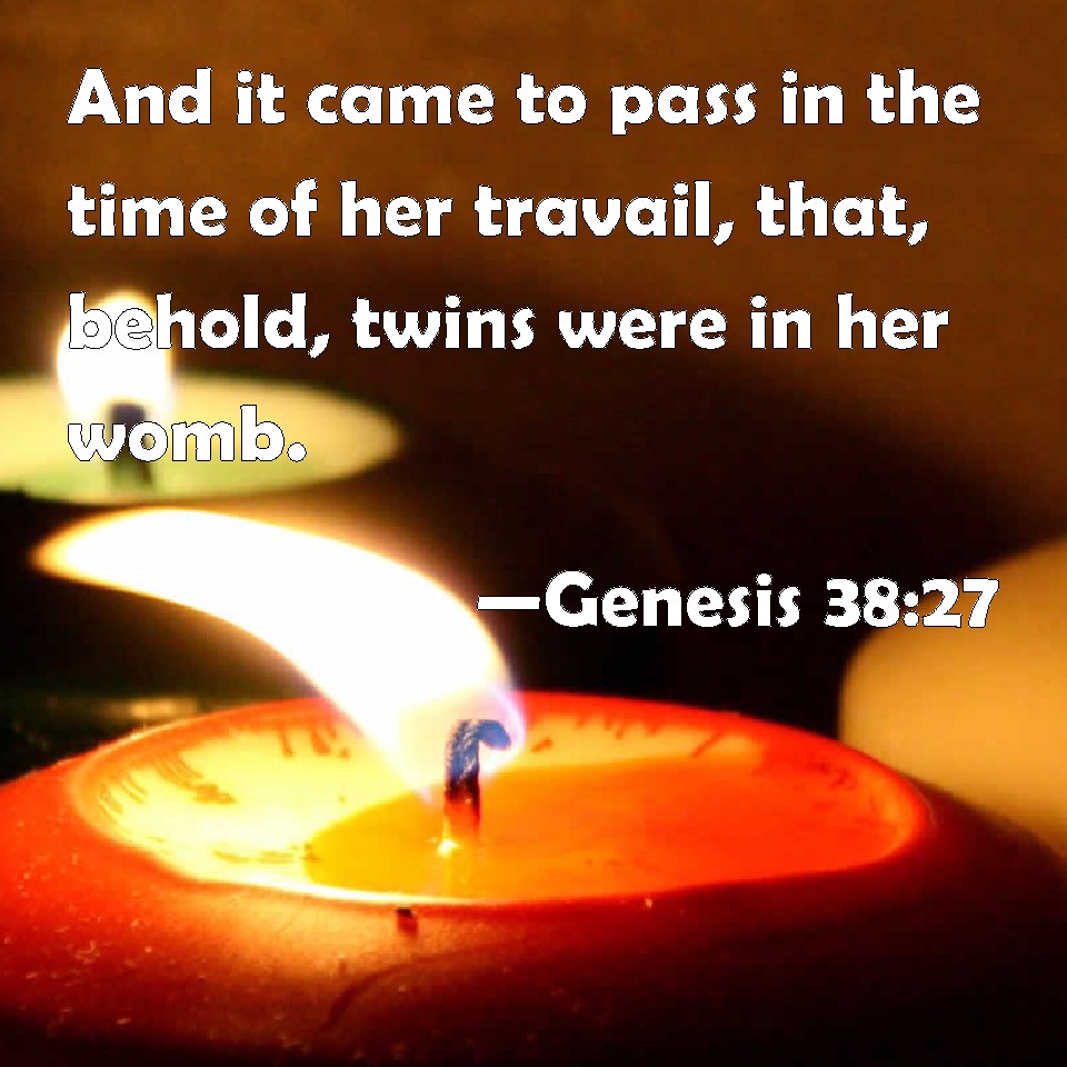 Choose a Background Genesis 38:27 And it came to pass in the time of her travail, that, behold, twins were in her womb. KJV: And it came to pass in the time of her travail, that, behold, twins were in her womb. DRB: And when she was ready to be brought to bed, there appeared twins in her womb: and in the very delivery of the infants, one put forth a hand, whereon the midwife tied a scarlet thread, saying: DBT: And it came to pass at the time of her delivery, that behold, twins were in her womb. ERV: And it came to pass in the time of her travail, that, behold, twins were in her womb. WBT: And it came to pass in the time of her travail, that behold, twins were in her womb. WEB: It happened in the time of her travail, that behold, twins were in her womb. YLT: And it cometh to pass in the time of her bearing, that lo, twins are in her womb;Links Genesis 38:27 NIV • Genesis 38:27 NLT • Genesis 38:27 ESV • Genesis 38:27 NASB • Genesis 38:27 KJV • Genesis 38:27 Interlinear • Genesis 38:27 Commentaries • Genesis 38:27 Parallel Texts • Genesis 38:27 Bible Apps • Genesis 38:27 Parallel • Bible Hub |
