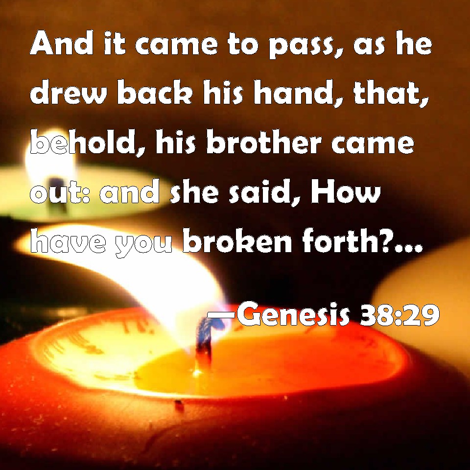 Choose a Background Genesis 38:29 And it came to pass, as he drew back his hand, that, behold, his brother came out: and she said, How have you broken forth? this breach be on you: therefore his name was called Pharez. KJV: And it came to pass, as he drew back his hand, that, behold, his brother came out: and she said, How hast thou broken forth? this breach be upon thee: therefore his name was called Pharez. DRB: But he drawing back his hand, the other came forth: and the woman said: Why is the partition divided for thee? and therefore called his name Phares. DBT: And it came to pass as he drew back his hand, that behold, his brother came out; and she said, How hast thou broken forth! on thee be the breach! And they called his name Pherez. ERV: And it came to pass, as he drew back his hand, that, behold, his brother came out: and she said, Wherefore hast thou made a breach for thyself? therefore his name was called Perez. WBT: And it came to pass as he drew back his hand, that behold, his brother came out; and she said, How hast thou broken forth? this breach be upon thee: therefore his name was called Pharez. WEB: It happened, as he drew back his hand, that behold, his brother came out, and she said, "Why have you made a breach for yourself?" Therefore his name was called Perez. YLT: And it cometh to pass as he draweth back his hand, that lo, his brother hath come out, and she saith, 'What! thou hast broken forth — on thee is the breach;' and he calleth his name Pharez;Links Genesis 38:29 NIV • Genesis 38:29 NLT • Genesis 38:29 ESV • Genesis 38:29 NASB • Genesis 38:29 KJV • Genesis 38:29 Interlinear • Genesis 38:29 Commentaries • Genesis 38:29 Parallel Texts • Genesis 38:29 Bible Apps • Genesis 38:29 Parallel • Bible Hub |