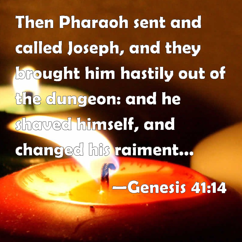 Choose a Background Genesis 41:14 Then Pharaoh sent and called Joseph, and they brought him hastily out of the dungeon: and he shaved himself, and changed his raiment, and came in to Pharaoh. KJV: Then Pharaoh sent and called Joseph, and they brought him hastily out of the dungeon: and he shaved himself, and changed his raiment, and came in unto Pharaoh. DRB: Forthwith at the king's command, Joseph was brought out of the prison, and they shaved him, and changing his apparel, brought him in to him. DBT: Then Pharaoh sent and called Joseph; and they brought him hastily out of the dungeon. And he shaved himself, and changed his clothes, and came in to Pharaoh. ERV: Then Pharaoh sent and called Joseph, and they brought him hastily out of the dungeon: and he shaved himself, and changed his raiment, and came in unto Pharaoh. WBT: Then Pharaoh sent and called Joseph, and they brought him hastily out of the dungeon: and he shaved himself, and changed his raiment, and came before Pharaoh. WEB: Then Pharaoh sent and called Joseph, and they brought him hastily out of the dungeon. He shaved himself, changed his clothing, and came in to Pharaoh. YLT: And Pharaoh sendeth and calleth Joseph, and they cause him to run out of the pit, and he shaveth, and changeth his garments, and cometh in unto Pharaoh.Links Genesis 41:14 NIV • Genesis 41:14 NLT • Genesis 41:14 ESV • Genesis 41:14 NASB • Genesis 41:14 KJV • Genesis 41:14 Interlinear • Genesis 41:14 Commentaries • Genesis 41:14 Parallel Texts • Genesis 41:14 Bible Apps • Genesis 41:14 Parallel • Bible Hub |