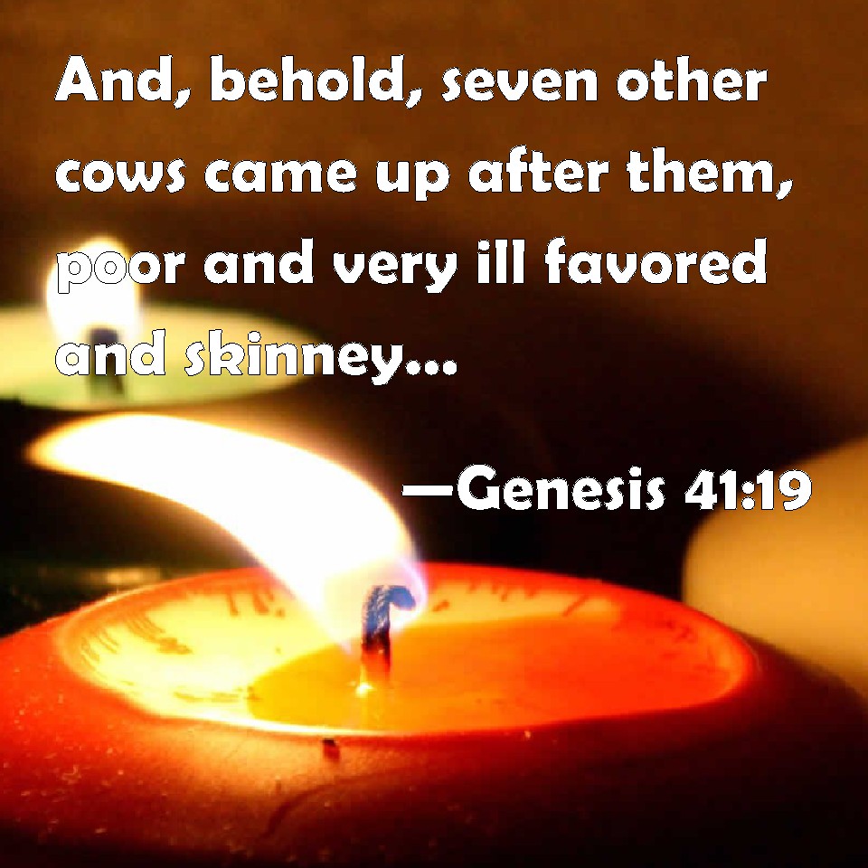 Choose a Background Genesis 41:19 And, behold, seven other cows came up after them, poor and very ill favored and skinney, such as I never saw in all the land of Egypt for badness: KJV: And, behold, seven other kine came up after them, poor and very ill favoured and leanfleshed, such as I never saw in all the land of Egypt for badness: DRB: And behold, there followed these, other seven kine, so very ill favoured and lean, that I never saw the like in the land of Egypt: DBT: And behold, seven other kine came up after them, poor, and very ill-formed, and lean-fleshed such as I never saw in all the land of Egypt for badness. ERV: and, behold, seven other kine came up after them, poor and very ill favoured and leanfleshed, such as I never saw in all the land of Egypt for badness: WBT: And behold, seven other cows came out after them, poor, and very ill-favored, and lean-fleshed, such as I never saw in all the land of Egypt for badness: WEB: and behold, seven other cattle came up after them, poor and very ugly and thin, such as I never saw in all the land of Egypt for ugliness. YLT: and lo, seven other kine are coming up after them, thin, and of very bad form, and lean in flesh; I have not seen like these in all the land of Egypt for badness.Links Genesis 41:19 NIV • Genesis 41:19 NLT • Genesis 41:19 ESV • Genesis 41:19 NASB • Genesis 41:19 KJV • Genesis 41:19 Interlinear • Genesis 41:19 Commentaries • Genesis 41:19 Parallel Texts • Genesis 41:19 Bible Apps • Genesis 41:19 Parallel • Bible Hub |