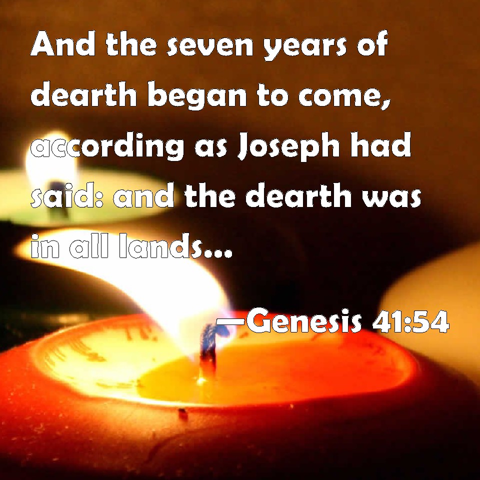 Choose a Background Genesis 41:54 And the seven years of dearth began to come, according as Joseph had said: and the dearth was in all lands; but in all the land of Egypt there was bread. KJV: And the seven years of dearth began to come, according as Joseph had said: and the dearth was in all lands; but in all the land of Egypt there was bread. DRB: The seven years of scarcity, which Joseph had foretold, began to come: and the famine prevailed in the whole world, but there was bread in all the land of Egypt. DBT: and the seven years of the dearth began to come, according as Joseph had said. And there was dearth in all lands; but in all the land of Egypt there was bread. ERV: And the seven years of famine began to come, according as Joseph had said: and there was famine in all lands; but in all the land of Egypt there was bread. WBT: And the seven years of dearth began to come, according as Joseph had said: and the dearth was in all lands; but in all the land of Egypt there was bread. WEB: The seven years of famine began to come, just as Joseph had said. There was famine in all lands, but in all the land of Egypt there was bread. YLT: and the seven years of famine begin to come, as Joseph said, and famine is in all the lands, but in all the land of Egypt hath been bread;Links Genesis 41:54 NIV • Genesis 41:54 NLT • Genesis 41:54 ESV • Genesis 41:54 NASB • Genesis 41:54 KJV • Genesis 41:54 Interlinear • Genesis 41:54 Commentaries • Genesis 41:54 Parallel Texts • Genesis 41:54 Bible Apps • Genesis 41:54 Parallel • Bible Hub |