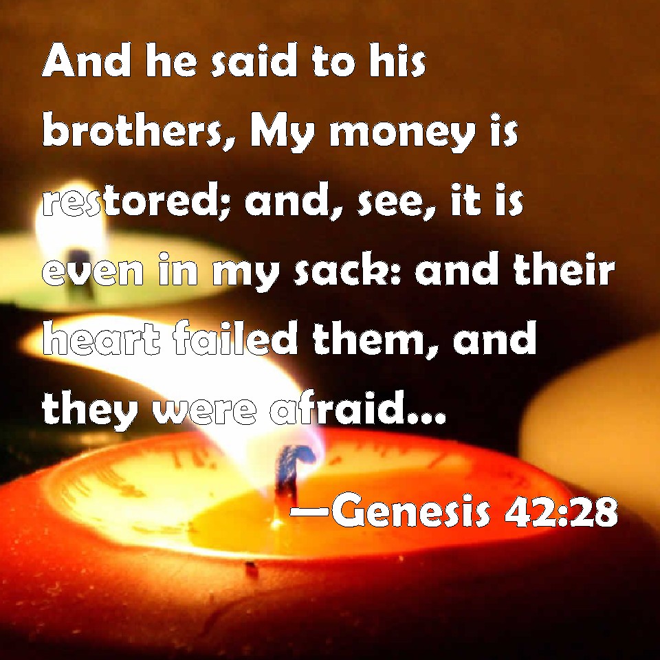 Choose a Background Genesis 42:28 And he said to his brothers, My money is restored; and, see, it is even in my sack: and their heart failed them, and they were afraid, saying one to another, What is this that God has done to us? KJV: And he said unto his brethren, My money is restored; and, lo, it is even in my sack: and their heart failed them, and they were afraid, saying one to another, What is this that God hath done unto us? DRB: And said to his brethren: My money is given me again, hehold it is in the sack. And thye were astonished, and troubled, and said to one another: What is this that God hath done unto us? DBT: And he said to his brethren, My money is returned to me, and behold, it is even in my sack. And their heart failed them, and they were afraid, saying one to another, What is this that God has done to us? ERV: And he said unto his brethren, My money is restored; and, lo, it is even in my sack: and their heart failed them, and they turned trembling one to another, saying, What is this that God hath done unto us? WBT: And he said to his brethren, My money is restored; and see it is even in my sack: and their heart failed them, and they were afraid, saying one to another, What is this that God hath done to us? WEB: He said to his brothers, "My money is restored! Behold, it is in my sack!" Their hearts failed them, and they turned trembling one to another, saying, "What is this that God has done to us?" YLT: and he saith unto his brethren, 'My money hath been put back, and also, lo, in my bag:' and their heart goeth out, and they tremble, one to another saying, 'What is this God hath done to us!'Links Genesis 42:28 NIV • Genesis 42:28 NLT • Genesis 42:28 ESV • Genesis 42:28 NASB • Genesis 42:28 KJV • Genesis 42:28 Interlinear • Genesis 42:28 Commentaries • Genesis 42:28 Parallel Texts • Genesis 42:28 Bible Apps • Genesis 42:28 Parallel • Bible Hub |