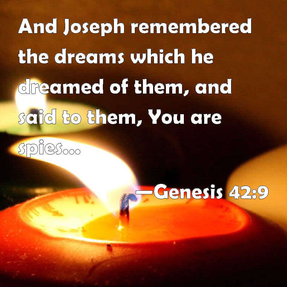 Choose a Background Genesis 42:9 And Joseph remembered the dreams which he dreamed of them, and said to them, You are spies; to see the nakedness of the land you are come. KJV: And Joseph remembered the dreams which he dreamed of them, and said unto them, Ye are spies; to see the nakedness of the land ye are come. DRB: And remembering the dreams, which formerly he had dreamed, he said to them: You are spies. You are come to view the weaker parts of the land. DBT: And Joseph remembered the dreams that he had dreamt of them; and he said to them, Ye are spies: to see the exposed places of the land ye are come. ERV: And Joseph remembered the dreams which he dreamed of them, and said unto them, Ye are spies; to see the nakedness of the land ye are come. WBT: And Joseph remembered the dreams which he dreamed of them, and said to them, Ye are spies; to see the nakedness of the land have ye come. WEB: Joseph remembered the dreams which he dreamed about them, and said to them, "You are spies! You have come to see the nakedness of the land." YLT: and Joseph remembereth the dreams which he dreamed of them, and saith unto them, 'Ye are spies; to see the nakedness of the land ye have come.'Links Genesis 42:9 NIV • Genesis 42:9 NLT • Genesis 42:9 ESV • Genesis 42:9 NASB • Genesis 42:9 KJV • Genesis 42:9 Interlinear • Genesis 42:9 Commentaries • Genesis 42:9 Parallel Texts • Genesis 42:9 Bible Apps • Genesis 42:9 Parallel • Bible Hub |