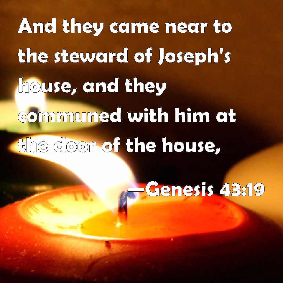 Choose a Background Genesis 43:19 And they came near to the steward of Joseph's house, and they communed with him at the door of the house, KJV: And they came near to the steward of Joseph's house, and they communed with him at the door of the house, DRB: Wherefore going up to the steward of the house, at the door, DBT: And they came up to the man that was over Joseph's house, and they spoke to him at the door of the house, ERV: And they came near to the steward of Joseph's house, and they spake unto him at the door of the house, WBT: And they came near to the steward of Joseph's house, and they communed with him at the door of the house, WEB: They came near to the steward of Joseph's house, and they spoke to him at the door of the house, YLT: And they come nigh unto the man who is over the house of Joseph, and speak unto him at the opening of the house,Links Genesis 43:19 NIV • Genesis 43:19 NLT • Genesis 43:19 ESV • Genesis 43:19 NASB • Genesis 43:19 KJV • Genesis 43:19 Interlinear • Genesis 43:19 Commentaries • Genesis 43:19 Parallel Texts • Genesis 43:19 Bible Apps • Genesis 43:19 Parallel • Bible Hub |