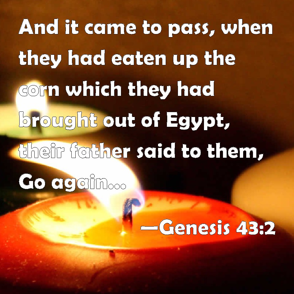 Choose a Background Genesis 43:2 And it came to pass, when they had eaten up the corn which they had brought out of Egypt, their father said to them, Go again, buy us a little food. KJV: And it came to pass, when they had eaten up the corn which they had brought out of Egypt, their father said unto them, Go again, buy us a little food. DRB: And when they had eaten up all the corn, which they had brought out of Egypt, Jacob said to his sons: Go again and buy us a little food. DBT: And it came to pass, when they had finished eating the grain which they had brought from Egypt, that their father said to them, Go again, buy us a little food. ERV: And it came to pass, when they had eaten up the corn which they had brought out of Egypt, their father said unto them, Go again, buy us a little food. WBT: And it came to pass, when they had consumed the corn which they had brought from Egypt, their father said to them, Go again, buy us a little food. WEB: It happened, when they had eaten up the grain which they had brought out of Egypt, their father said to them, "Go again, buy us a little more food." YLT: and it cometh to pass, when they have finished eating the corn which they brought from Egypt, that their father saith unto them, 'Turn back, buy for us a little food.'Links Genesis 43:2 NIV • Genesis 43:2 NLT • Genesis 43:2 ESV • Genesis 43:2 NASB • Genesis 43:2 KJV • Genesis 43:2 Interlinear • Genesis 43:2 Commentaries • Genesis 43:2 Parallel Texts • Genesis 43:2 Bible Apps • Genesis 43:2 Parallel • Bible Hub |