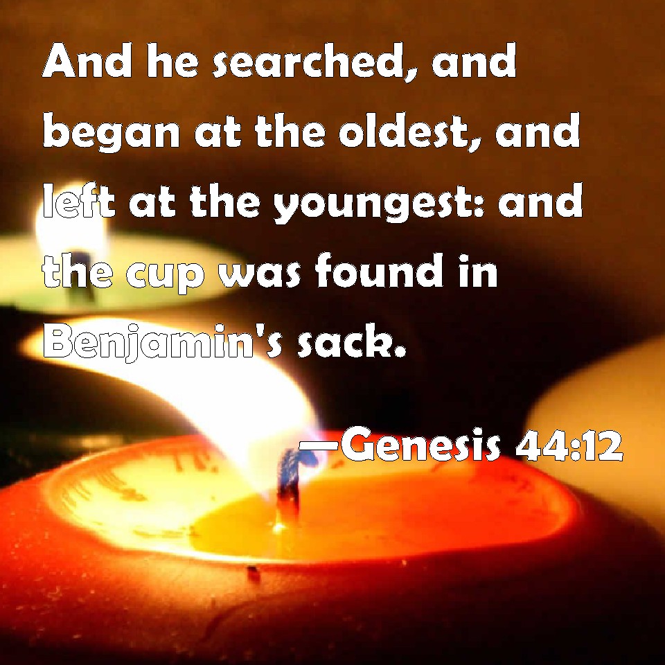 Choose a Background Genesis 44:12 And he searched, and began at the oldest, and left at the youngest: and the cup was found in Benjamin's sack. KJV: And he searched, and began at the eldest, and left at the youngest: and the cup was found in Benjamin's sack. DRB: Which when he had searched, beginning at the eldest and ending at the youngest, he found the cup in Benjamin's sack. DBT: And he searched carefully: he began at the eldest, and ended at the youngest; and the cup was found in Benjamin's sack. ERV: And he searched, and began at the eldest, and left at the youngest: and the cup was found in Benjamin's sack. WBT: And he searched, and began at the eldest, and left at the youngest: and the cup was found in Benjamin's sack. WEB: He searched, beginning with the eldest, and ending at the youngest. The cup was found in Benjamin's sack. YLT: and he searcheth — at the eldest he hath begun, and at the youngest he hath completed — and the cup is found in the bag of Benjamin;Links Genesis 44:12 NIV • Genesis 44:12 NLT • Genesis 44:12 ESV • Genesis 44:12 NASB • Genesis 44:12 KJV • Genesis 44:12 Interlinear • Genesis 44:12 Commentaries • Genesis 44:12 Parallel Texts • Genesis 44:12 Bible Apps • Genesis 44:12 Parallel • Bible Hub |