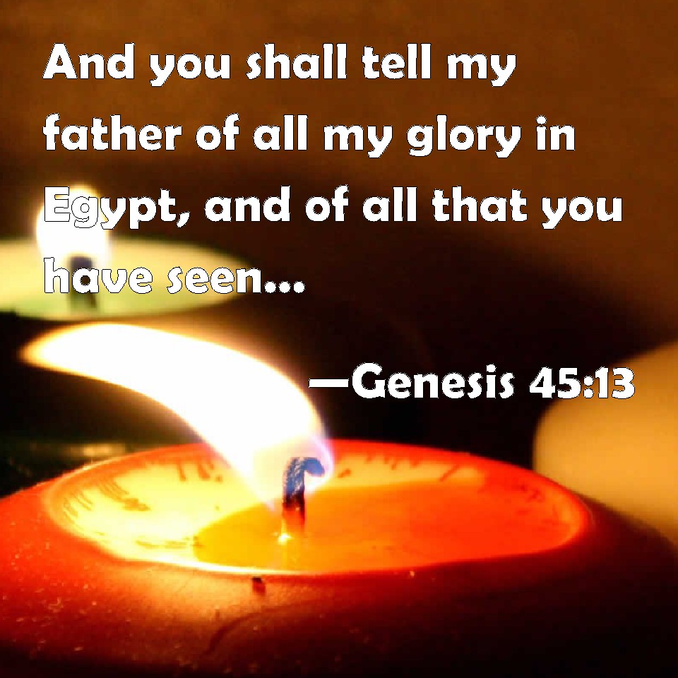 Choose a Background Genesis 45:13 And you shall tell my father of all my glory in Egypt, and of all that you have seen; and you shall haste and bring down my father here. KJV: And ye shall tell my father of all my glory in Egypt, and of all that ye have seen; and ye shall haste and bring down my father hither. DRB: You shall tell my father of all my glory, and all things that you have seen in Egypt: make haste and bring him to me. DBT: And tell my father of all my glory in Egypt, and of all that ye have seen, and haste and bring down my father hither. ERV: And ye shall tell my father of all my glory in Egypt, and of all that ye have seen; and ye shall haste and bring down my father hither. WBT: And ye shall tell my father of all my glory in Egypt, and of all that ye have seen: and ye shall haste, and bring down my father hither. WEB: You shall tell my father of all my glory in Egypt, and of all that you have seen. You shall hurry and bring my father down here." YLT: and ye have declared to my father all my honour in Egypt, and all that ye have seen, and ye have hasted, and have brought down my father hither.'Links Genesis 45:13 NIV • Genesis 45:13 NLT • Genesis 45:13 ESV • Genesis 45:13 NASB • Genesis 45:13 KJV • Genesis 45:13 Interlinear • Genesis 45:13 Commentaries • Genesis 45:13 Parallel Texts • Genesis 45:13 Bible Apps • Genesis 45:13 Parallel • Bible Hub |