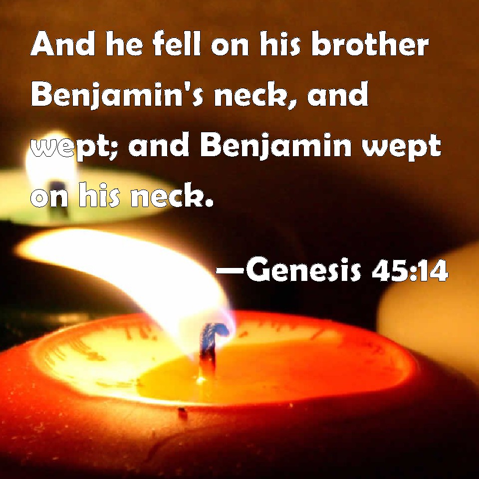 Choose a Background Genesis 45:14 And he fell on his brother Benjamin's neck, and wept; and Benjamin wept on his neck. KJV: And he fell upon his brother Benjamin's neck, and wept; and Benjamin wept upon his neck. DRB: And falling upon the neck of his brother Benjamin, he embraced him and wept: and Benjamin in like manner wept also on his neck. DBT: And he fell on his brother Benjamin's neck, and wept; and Benjamin wept on his neck. ERV: And he fell upon his brother Benjamin's neck, and wept; and Benjamin wept upon his neck. WBT: And he fell upon his brother Benjamin's neck, and wept; and Benjamin wept upon his neck. WEB: He fell on his brother Benjamin's neck, and wept, and Benjamin wept on his neck. YLT: And he falleth on the neck of Benjamin his brother, and weepeth, and Benjamin hath wept on his neck;Links Genesis 45:14 NIV • Genesis 45:14 NLT • Genesis 45:14 ESV • Genesis 45:14 NASB • Genesis 45:14 KJV • Genesis 45:14 Interlinear • Genesis 45:14 Commentaries • Genesis 45:14 Parallel Texts • Genesis 45:14 Bible Apps • Genesis 45:14 Parallel • Bible Hub |
