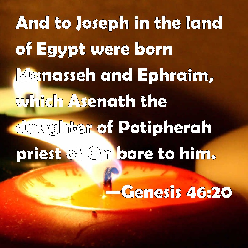 Choose a Background Genesis 46:20 And to Joseph in the land of Egypt were born Manasseh and Ephraim, which Asenath the daughter of Potipherah priest of On bore to him. KJV: And unto Joseph in the land of Egypt were born Manasseh and Ephraim, which Asenath the daughter of Potipherah priest of On bare unto him. DRB: And sons were born to Joseph, in the land of Egypt, whom Aseneth the daughter of Putiphare priest of Heliopolis bore him: Manasses and Ephraim. DBT: And to Joseph in the land of Egypt were born Manasseh and Ephraim, whom Asnath bore to him, the daughter of Potipherah the priest in On. ERV: And unto Joseph in the land of Egypt were born Manasseh and Ephraim, which Asenath the daughter of Poti-phera priest of On bare unto him. WBT: And to Joseph in the land of Egypt were born Manasseh and Ephraim, whom Asenath the daughter of Poti-pherah priest of On bore to him. WEB: To Joseph in the land of Egypt were born Manasseh and Ephraim, whom Asenath, the daughter of Potiphera, priest of On, bore to him. YLT: And born to Joseph in the land of Egypt (whom Asenath daughter of Poti-Pherah, priest of On, hath borne to him) are Manasseh and Ephraim.Links Genesis 46:20 NIV • Genesis 46:20 NLT • Genesis 46:20 ESV • Genesis 46:20 NASB • Genesis 46:20 KJV • Genesis 46:20 Interlinear • Genesis 46:20 Commentaries • Genesis 46:20 Parallel Texts • Genesis 46:20 Bible Apps • Genesis 46:20 Parallel • Bible Hub |