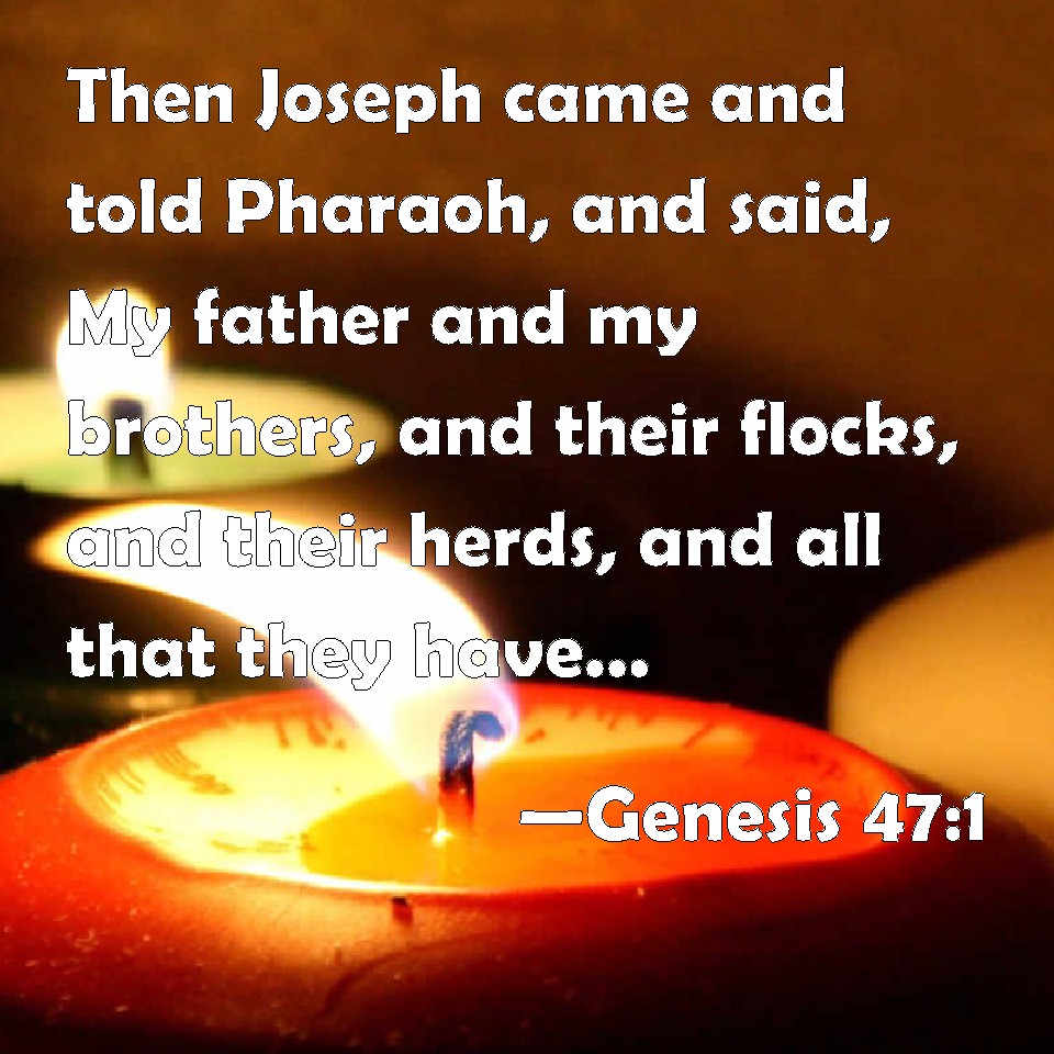 Choose a Background Genesis 47:1 Then Joseph came and told Pharaoh, and said, My father and my brothers, and their flocks, and their herds, and all that they have, are come out of the land of Canaan; and, behold, they are in the land of Goshen. KJV: Then Joseph came and told Pharaoh, and said, My father and my brethren, and their flocks, and their herds, and all that they have, are come out of the land of Canaan; and, behold, they are in the land of Goshen. DRB: Then Joseph went in and told Pharao, saying: My father and brethren, their sheep and their herds, and all that they possess, are come out of the land of Chanaan: and behold they stay in the land of Gessen. DBT: And Joseph came and told Pharaoh and said, My father and my brethren, and their sheep and their cattle, and all that they have, are come out of the land of Canaan; and behold, they are in the land of Goshen. ERV: Then Joseph went in and told Pharaoh, and said, My father and my brethren, and their flocks, and their herds, and all that they have, are come out of the land of Canaan; and, behold, they are in the land of Goshen. WBT: Then Joseph came and told Pharaoh, and said, My father and my brethren, and their flocks, and their herds, and all that they have, have come from the land of Canaan; and behold, they are in the land of Goshen. WEB: Then Joseph went in and told Pharaoh, and said, "My father and my brothers, with their flocks, their herds, and all that they own, have come out of the land of Canaan; and behold, they are in the land of Goshen." YLT: And Joseph cometh, and declareth to Pharaoh, and saith, 'My father, and my brethren, and their flock, and their herd, and all they have, have come from the land of Canaan, and lo, they are in the land of Goshen.'Links Genesis 47:1 NIV • Genesis 47:1 NLT • Genesis 47:1 ESV • Genesis 47:1 NASB • Genesis 47:1 KJV • Genesis 47:1 Interlinear • Genesis 47:1 Commentaries • Genesis 47:1 Parallel Texts • Genesis 47:1 Bible Apps • Genesis 47:1 Parallel • Bible Hub |