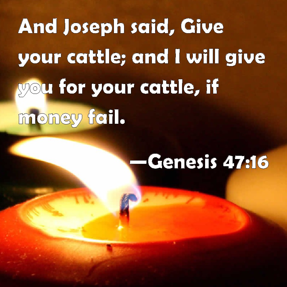 Choose a Background Genesis 47:16 And Joseph said, Give your cattle; and I will give you for your cattle, if money fail. KJV: And Joseph said, Give your cattle; and I will give you for your cattle, if money fail. DRB: And he answered them: Bring your cattle, and for them I will give you food, if you have no money. DBT: And Joseph said, Give your cattle, and I will give you for your cattle, if your money be all gone. ERV: And Joseph said, Give your cattle; and I will give you for your cattle, if money fail. WBT: And Joseph said, Give your cattle; and I will give you for your cattle, if money hath failed. WEB: Joseph said, "Give me your livestock; and I will give you food for your livestock, if your money is gone." YLT: and Joseph saith, 'Give your cattle; and I give to you for your cattle, if the money hath ceased.'Links Genesis 47:16 NIV • Genesis 47:16 NLT • Genesis 47:16 ESV • Genesis 47:16 NASB • Genesis 47:16 KJV • Genesis 47:16 Interlinear • Genesis 47:16 Commentaries • Genesis 47:16 Parallel Texts • Genesis 47:16 Bible Apps • Genesis 47:16 Parallel • Bible Hub |