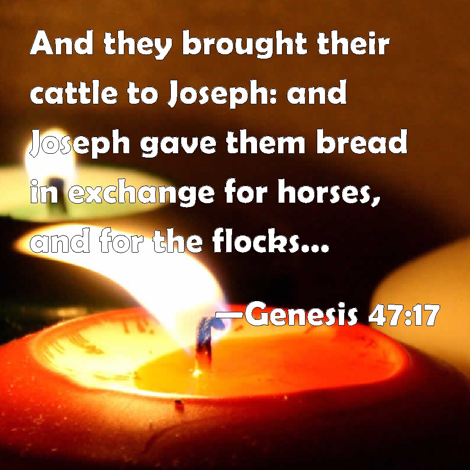 Choose a Background Genesis 47:17 And they brought their cattle to Joseph: and Joseph gave them bread in exchange for horses, and for the flocks, and for the cattle of the herds, and for the asses: and he fed them with bread for all their cattle for that year. KJV: And they brought their cattle unto Joseph: and Joseph gave them bread in exchange for horses, and for the flocks, and for the cattle of the herds, and for the asses: and he fed them with bread for all their cattle for that year. DRB: And when they had brought them, he gave them food in exchange for their horses, and sheep, and oxen, end asses and he maintained them that year for the exchange of their cattle. DBT: And they brought their cattle to Joseph; and Joseph gave them bread for horses, and for flocks of sheep, and for herds of cattle, and for asses; and he fed them with bread for all their cattle that year. ERV: And they brought their cattle unto Joseph: and Joseph gave them bread in exchange for the horses, and for the flocks, and for the herds, and for the asses: and he fed them with bread in exchange for all their cattle for that year. WBT: And they brought their cattle to Joseph: and Joseph gave them bread in exchange for horses, and for the flocks, and for the cattle of the herds, and for the asses; and he fed them with bread, for all their cattle, for that year. WEB: They brought their livestock to Joseph, and Joseph gave them bread in exchange for the horses, and for the flocks, and for the herds, and for the donkeys: and he fed them with bread in exchange for all their livestock for that year. YLT: And they bring in their cattle unto Joseph, and Joseph giveth to them bread, for the horses, and for the cattle of the flock, and for the cattle of the herd, and for the asses; and he tendeth them with bread, for all their cattle, during that year.Links Genesis 47:17 NIV • Genesis 47:17 NLT • Genesis 47:17 ESV • Genesis 47:17 NASB • Genesis 47:17 KJV • Genesis 47:17 Interlinear • Genesis 47:17 Commentaries • Genesis 47:17 Parallel Texts • Genesis 47:17 Bible Apps • Genesis 47:17 Parallel • Bible Hub |