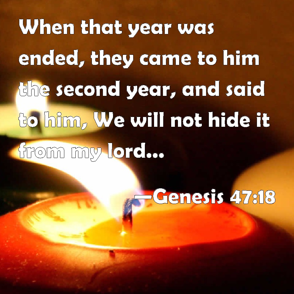 Choose a Background Genesis 47:18 When that year was ended, they came to him the second year, and said to him, We will not hide it from my lord, how that our money is spent; my lord also has our herds of cattle; there is not ought left in the sight of my lord, but our bodies, and our lands: KJV: When that year was ended, they came unto him the second year, and said unto him, We will not hide it from my lord, how that our money is spent; my lord also hath our herds of cattle; there is not ought left in the sight of my lord, but our bodies, and our lands: DRB: And they came the second year, and said to him: We will not hide from our lord, how that our money is spent, and our cattle also are gone: neither art thou ignorant that we have nothing now left but our bodies and our lands. DBT: And that year ended; and they came to him the second year, and said to him, We will not hide it from my lord that since our money is come to an end, and the herds of cattle are in the possession of my lord, nothing is left before my lord but our bodies and our land. ERV: And when that year was ended, they came unto him the second year, and said unto him, We will not hide from my lord, how that our money is all spent; and the herds of cattle are my lord's; there is nought left in the sight of my lord, but our bodies, and our lands: WBT: When that year was ended, they came to him the second year, and said to him, We will not hide from my lord, how that our money is spent; my lord also hath our herds of cattle; there is not aught left in the sight of my lord, but our bodies and our lands: WEB: When that year was ended, they came to him the second year, and said to him, "We will not hide from my lord how our money is all spent, and the herds of livestock are my lord's. There is nothing left in the sight of my lord, but our bodies, and our lands. YLT: And that year is finished, and they come in unto him on the second year, and say to him, 'We do not hide from my lord, that since the money hath been finished, and possession of the cattle is unto my lord, there hath not been left before my lord save our bodies, and our ground;Links Genesis 47:18 NIV • Genesis 47:18 NLT • Genesis 47:18 ESV • Genesis 47:18 NASB • Genesis 47:18 KJV • Genesis 47:18 Interlinear • Genesis 47:18 Commentaries • Genesis 47:18 Parallel Texts • Genesis 47:18 Bible Apps • Genesis 47:18 Parallel • Bible Hub |