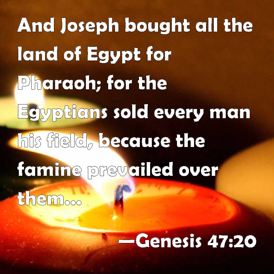 Choose a Background Genesis 47:20 And Joseph bought all the land of Egypt for Pharaoh; for the Egyptians sold every man his field, because the famine prevailed over them: so the land became Pharaoh's. KJV: And Joseph bought all the land of Egypt for Pharaoh; for the Egyptians sold every man his field, because the famine prevailed over them: so the land became Pharaoh's. DRB: So Joseph bought all the land of Egypt, every man selling his possessions, because of the greatness of the famine. And he brought it into Pharao's hands: DBT: And Joseph bought all the soil of Egypt for Pharaoh; for the Egyptians sold every man his field, because the famine prevailed over them; and the land became Pharaoh's. ERV: So Joseph bought all the land of Egypt for Pharaoh; for the Egyptians sold every man his field, because the famine was sore upon them: and the land became Pharaoh's. WBT: And Joseph bought all the land of Egypt for Pharaoh; for the Egyptians sold every man his field, because the famine prevailed over them: so the land became Pharaoh's. WEB: So Joseph bought all the land of Egypt for Pharaoh, for every man of the Egyptians sold his field, because the famine was severe on them, and the land became Pharaoh's. YLT: And Joseph buyeth all the ground of Egypt for Pharaoh, for the Egyptians have sold each his field, for the famine hath been severe upon them, and the land becometh Pharaoh's;Links Genesis 47:20 NIV • Genesis 47:20 NLT • Genesis 47:20 ESV • Genesis 47:20 NASB • Genesis 47:20 KJV • Genesis 47:20 Interlinear • Genesis 47:20 Commentaries • Genesis 47:20 Parallel Texts • Genesis 47:20 Bible Apps • Genesis 47:20 Parallel • Bible Hub |