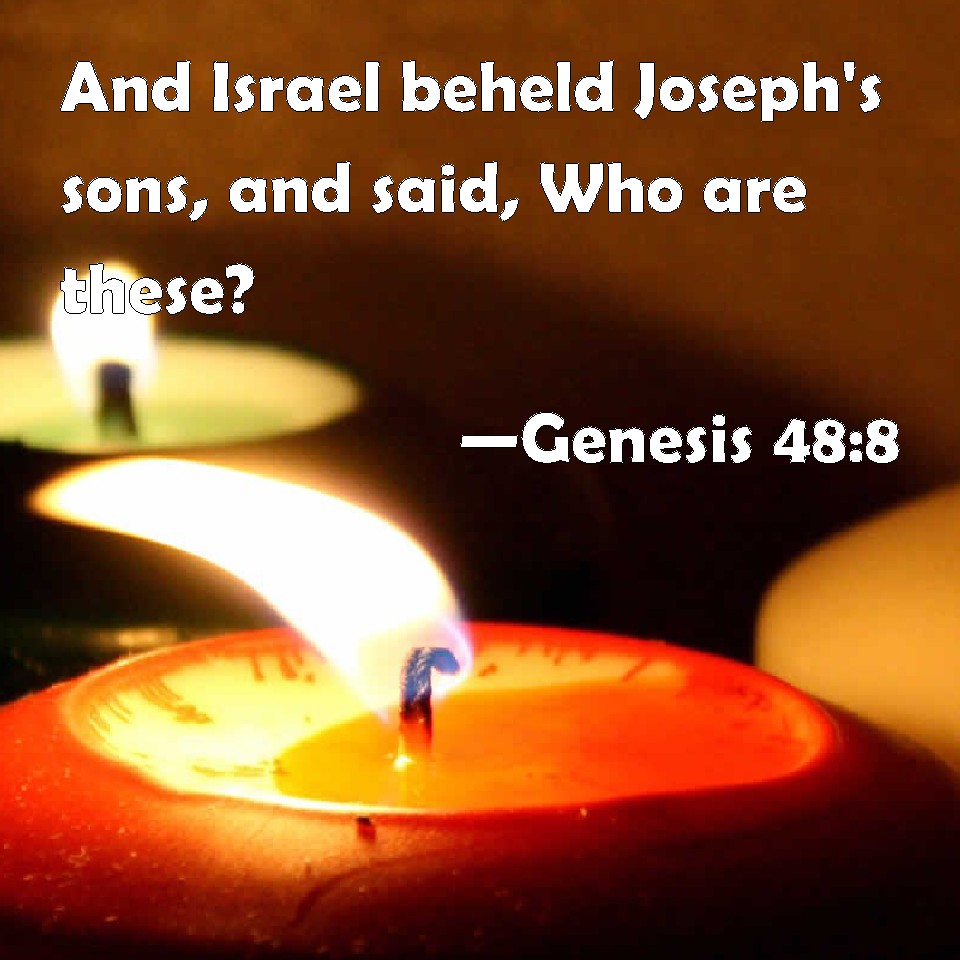 Choose a Background Genesis 48:8 And Israel beheld Joseph's sons, and said, Who are these? KJV: And Israel beheld Joseph's sons, and said, Who are these? DRB: Then seeing his sons, he said to him: Who are these? DBT: And Israel beheld Joseph's sons, and said, Who are these? ERV: And Israel beheld Joseph's sons, and said, Who are these? WBT: And Israel beheld Joseph's sons, and said, Who are these? WEB: Israel saw Joseph's sons, and said, "Who are these?" YLT: And Israel seeth the sons of Joseph, and saith, 'Who are these?'Links Genesis 48:8 NIV • Genesis 48:8 NLT • Genesis 48:8 ESV • Genesis 48:8 NASB • Genesis 48:8 KJV • Genesis 48:8 Interlinear • Genesis 48:8 Commentaries • Genesis 48:8 Parallel Texts • Genesis 48:8 Bible Apps • Genesis 48:8 Parallel • Bible Hub |
