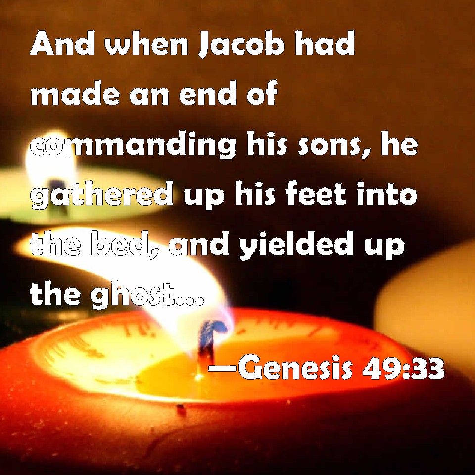 Choose a Background Genesis 49:33 And when Jacob had made an end of commanding his sons, he gathered up his feet into the bed, and yielded up the ghost, and was gathered to his people. KJV: And when Jacob had made an end of commanding his sons, he gathered up his feet into the bed, and yielded up the ghost, and was gathered unto his people. DRB: And when he had ended the commandments, wherewith he instructed his sons, he drew up his feet upon the bed, and died: and he was gathered to his people." DBT: And when Jacob had made an end of commanding his sons, he gathered his feet into the bed, and expired, and was gathered to his peoples. ERV: And when Jacob made an end of charging his sons, he gathered up his feet into the bed, and yielded up the ghost, and was gathered unto his people. WBT: And when Jacob had made an end of commanding his sons, he drew his feet into the bed, and expired, and was gathered to his people. WEB: When Jacob made an end of charging his sons, he gathered up his feet into the bed, and yielded up the spirit, and was gathered to his people. YLT: And Jacob finisheth commanding his sons, and gathereth up his feet unto the bed, and expireth, and is gathered unto his people.Links Genesis 49:33 NIV • Genesis 49:33 NLT • Genesis 49:33 ESV • Genesis 49:33 NASB • Genesis 49:33 KJV • Genesis 49:33 Interlinear • Genesis 49:33 Commentaries • Genesis 49:33 Parallel Texts • Genesis 49:33 Bible Apps • Genesis 49:33 Parallel • Bible Hub |