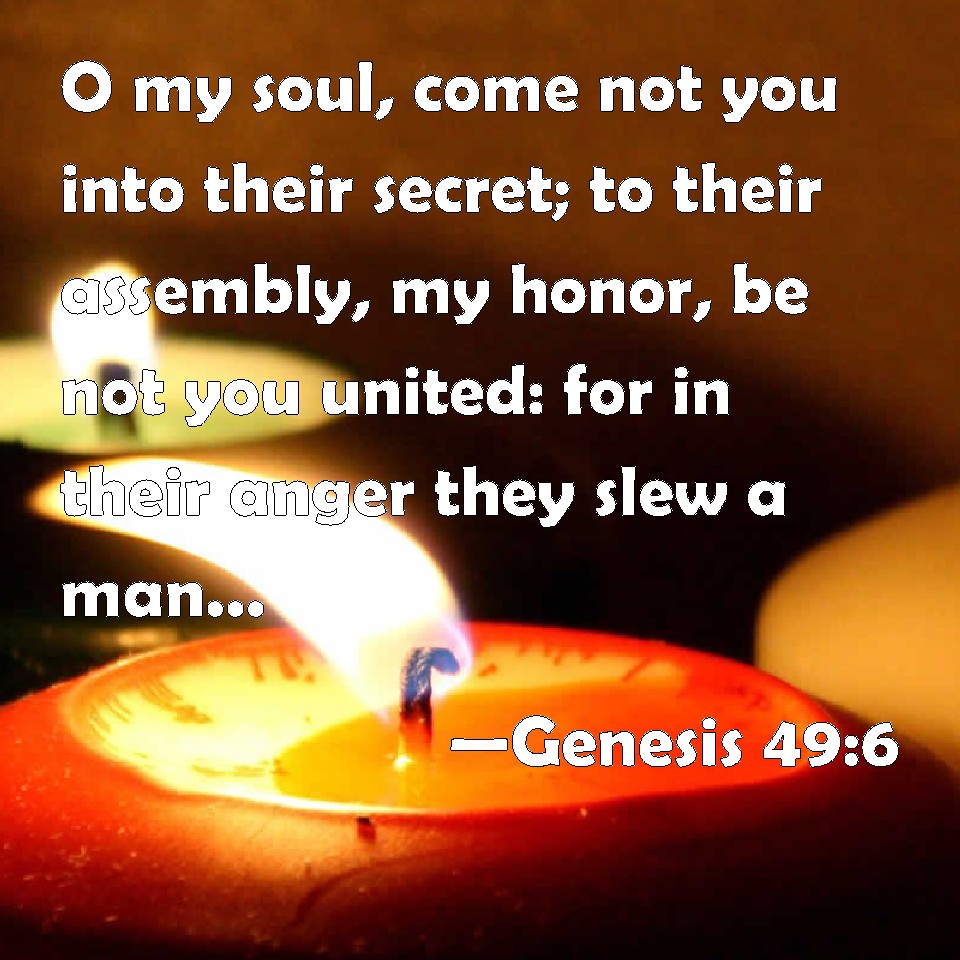 Choose a Background Genesis 49:6 O my soul, come not you into their secret; to their assembly, my honor, be not you united: for in their anger they slew a man, and in their self-will they dig down a wall. KJV: O my soul, come not thou into their secret; unto their assembly, mine honour, be not thou united: for in their anger they slew a man, and in their selfwill they digged down a wall. DRB: Let not my soul go into their counsel, nor my glory be in their assembly: "be- cause in their fury they slew a man, and in their selfwill they undermined a wall. DBT: My soul, come not into their council; Mine honour, be not united with their assembly; For in their anger they slew men, And in their wantonness houghed oxen. ERV: O my soul, come not thou into their council; Unto their assembly, my glory, be not thou united; For in their anger they slew a man, And in their selfwill they houghed an ox. WBT: O my soul, come not thou into their secret; to their assembly, my honor, be not thou united: for in their anger they slew a man, and in their self-will they digged down a wall. WEB: My soul, don't come into their council. My glory, don't be united to their assembly; for in their anger they killed men. In their self-will they hamstrung cattle. YLT: Into their secret, come not, O my soul! Unto their assembly be not united, O mine honour; For in their anger they slew a man, And in their self-will eradicated a prince.Links Genesis 49:6 NIV • Genesis 49:6 NLT • Genesis 49:6 ESV • Genesis 49:6 NASB • Genesis 49:6 KJV • Genesis 49:6 Interlinear • Genesis 49:6 Commentaries • Genesis 49:6 Parallel Texts • Genesis 49:6 Bible Apps • Genesis 49:6 Parallel • Bible Hub |