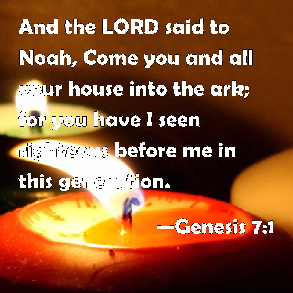 Choose a Background Genesis 7:1 And the LORD said to Noah, Come you and all your house into the ark; for you have I seen righteous before me in this generation. KJV: And the LORD said unto Noah, Come thou and all thy house into the ark; for thee have I seen righteous before me in this generation. DRB: And the Lord said to him: Go in thou and all thy house into the ark: for thee I have seen just before me in this generation. DBT: And Jehovah said to Noah, Go into the ark, thou and all thy house; for thee have I seen righteous before me in this generation. ERV: And the LORD said unto Noah, Come thou and all thy house into the ark; for thee have I seen righteous before me in this generation. WBT: And the LORD said to Noah, Come thou and all thy house into the ark: for thee have I seen righteous before me in this generation. WEB: Yahweh said to Noah, "Come with all of your household into the ship, for I have seen your righteousness before me in this generation. YLT: And Jehovah saith to Noah, 'Come in, thou and all thy house, unto the ark, for thee I have seen righteous before Me in this generation;Links Genesis 7:1 NIV • Genesis 7:1 NLT • Genesis 7:1 ESV • Genesis 7:1 NASB • Genesis 7:1 KJV • Genesis 7:1 Interlinear • Genesis 7:1 Commentaries • Genesis 7:1 Parallel Texts • Genesis 7:1 Bible Apps • Genesis 7:1 Parallel • Bible Hub |