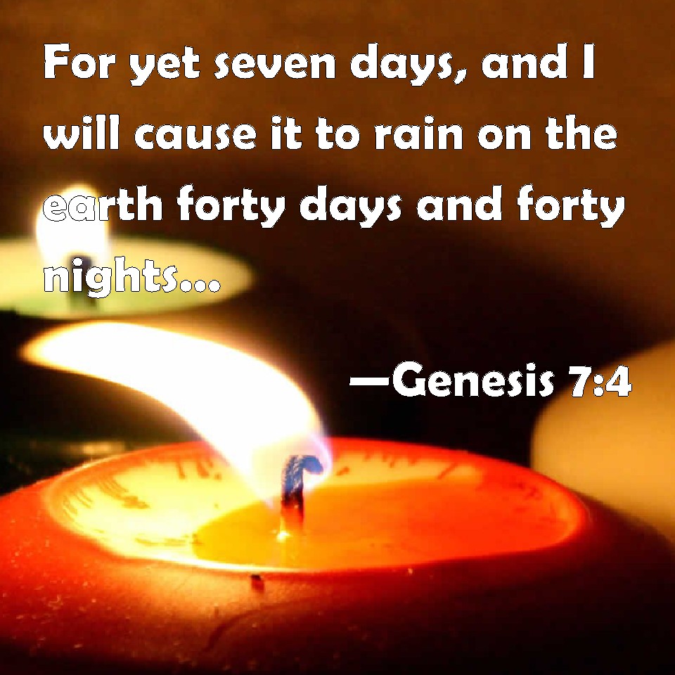 Choose a Background Genesis 7:4 For yet seven days, and I will cause it to rain on the earth forty days and forty nights; and every living substance that I have made will I destroy from off the face of the earth. KJV: For yet seven days, and I will cause it to rain upon the earth forty days and forty nights; and every living substance that I have made will I destroy from off the face of the earth. DRB: For yet a while, and after seven days, I will rain upon the earth forty days and forty nights; and I will destroy every substance that I have made, from the face of the earth. DBT: For in yet seven days I will cause it to rain on the earth forty days and forty nights; and every living being which I have made will I destroy from the ground. ERV: For yet seven days, and I will cause it to rain upon the earth forty days and forty nights; and every living thing that I have made will I destroy from off the face of the ground. WBT: For yet seven days, and I will cause it to rain upon the earth forty days and forty nights: and every living substance that I have made will I destroy from the face of the earth. WEB: In seven days, I will cause it to rain on the earth for forty days and forty nights. Every living thing that I have made, I will destroy from the surface of the ground." YLT: for after other seven days I am sending rain on the earth forty days and forty nights, and have wiped away all the substance that I have made from off the face of the ground.'Links Genesis 7:4 NIV • Genesis 7:4 NLT • Genesis 7:4 ESV • Genesis 7:4 NASB • Genesis 7:4 KJV • Genesis 7:4 Interlinear • Genesis 7:4 Commentaries • Genesis 7:4 Parallel Texts • Genesis 7:4 Bible Apps • Genesis 7:4 Parallel • Bible Hub |