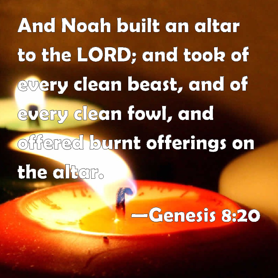 Choose a Background Genesis 8:20 And Noah built an altar to the LORD; and took of every clean beast, and of every clean fowl, and offered burnt offerings on the altar. KJV: And Noah builded an altar unto the LORD; and took of every clean beast, and of every clean fowl, and offered burnt offerings on the altar. DRB: And Noe built an altar unto the Lord: and taking of all cattle and fowls that were clean, offered holocausts upon the altar. DBT: And Noah built an altar to Jehovah; and took of every clean animal, and of all clean fowl, and offered up burnt-offerings on the altar. ERV: And Noah builded an altar unto the LORD; and took of every clean beast, and of every clean fowl, and offered burnt offerings on the altar. WBT: And Noah built an altar to the LORD, and took of every clean beast, and of every clean fowl, and offered burnt-offerings on the altar. WEB: Noah built an altar to Yahweh, and took of every clean animal, and of every clean bird, and offered burnt offerings on the altar. YLT: And Noah buildeth an altar to Jehovah, and taketh of every clean beast, and of every clean fowl, and causeth burnt-offerings to ascend on the altar;Links Genesis 8:20 NIV • Genesis 8:20 NLT • Genesis 8:20 ESV • Genesis 8:20 NASB • Genesis 8:20 KJV • Genesis 8:20 Interlinear • Genesis 8:20 Commentaries • Genesis 8:20 Parallel Texts • Genesis 8:20 Bible Apps • Genesis 8:20 Parallel • Bible Hub |