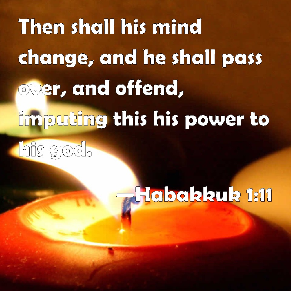 Choose a Background Habakkuk 1:11 Then shall his mind change, and he shall pass over, and offend, imputing this his power to his god. KJV: Then shall his mind change, and he shall pass over, and offend, imputing this his power unto his god. DRB: Then shall his spirit be changed, and he shall pass, and fall: this is his strength of his god. DBT: Then will his mind change, and he will pass on, and become guilty: this his power is become his +god. ERV: Then shall he sweep by as a wind, and shall pass over, and be guilty: even he whose might is his god. WBT: Then shall his mind change, and he shall pass over, and offend, imputing this his power to his god. WEB: Then he sweeps by like the wind, and goes on. He is indeed guilty, whose strength is his god." YLT: Then passed on hath the spirit, Yea, he doth transgress, And doth ascribe this his power to his god.Links Habakkuk 1:11 NIV • Habakkuk 1:11 NLT • Habakkuk 1:11 ESV • Habakkuk 1:11 NASB • Habakkuk 1:11 KJV • Habakkuk 1:11 Interlinear • Habakkuk 1:11 Commentaries • Habakkuk 1:11 Parallel Texts • Habakkuk 1:11 Bible Apps • Habakkuk 1:11 Parallel • Bible Hub |