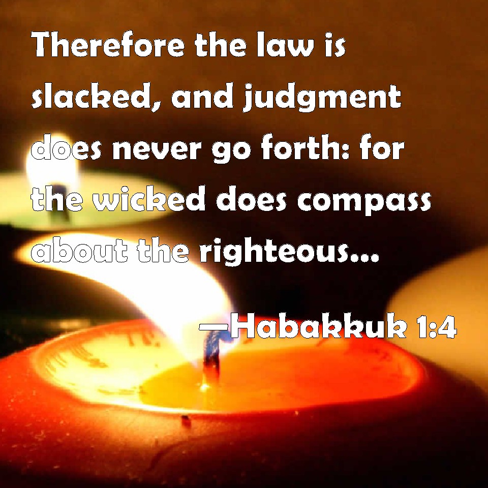 Choose a Background Habakkuk 1:4 Therefore the law is slacked, and judgment does never go forth: for the wicked does compass about the righteous; therefore wrong judgment proceeds. KJV: Therefore the law is slacked, and judgment doth never go forth: for the wicked doth compass about the righteous; therefore wrong judgment proceedeth. DRB: Therefore the law is torn in pieces, and judgment cometh not to the end: because the wicked prevaileth against the just, therefore wrong judgment goeth forth. DBT: Therefore the law is powerless, and justice doth never go forth; for the wicked encompasseth the righteous; therefore judgment goeth forth perverted. ERV: Therefore the law is slacked, and judgment doth never go forth: for the wicked doth compass about the righteous; therefore judgment goeth forth perverted. WBT: Therefore the law is slackened, and judgment doth never go forth: for the wicked doth encompass the righteous; therefore wrong judgment proceedeth. WEB: Therefore the law is paralyzed, and justice never goes forth; for the wicked surround the righteous; therefore justice goes forth perverted. YLT: Therefore doth law cease, And judgment doth not go forth for ever, For the wicked is compassing the righteous, Therefore wrong judgment goeth forth.Links Habakkuk 1:4 NIV • Habakkuk 1:4 NLT • Habakkuk 1:4 ESV • Habakkuk 1:4 NASB • Habakkuk 1:4 KJV • Habakkuk 1:4 Interlinear • Habakkuk 1:4 Commentaries • Habakkuk 1:4 Parallel Texts • Habakkuk 1:4 Bible Apps • Habakkuk 1:4 Parallel • Bible Hub |