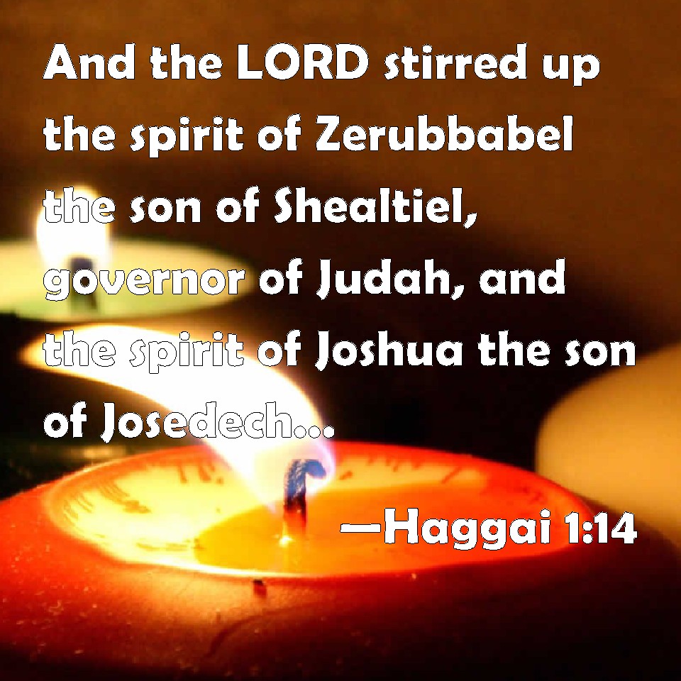 Choose a Background Haggai 1:14 And the LORD stirred up the spirit of Zerubbabel the son of Shealtiel, governor of Judah, and the spirit of Joshua the son of Josedech, the high priest, and the spirit of all the remnant of the people; and they came and did work in the house of the LORD of hosts, their God, KJV: And the LORD stirred up the spirit of Zerubbabel the son of Shealtiel, governor of Judah, and the spirit of Joshua the son of Josedech, the high priest, and the spirit of all the remnant of the people; and they came and did work in the house of the LORD of hosts, their God, DRB: And the Lord stirred up the spirit of Zorobabel the son of Salathiel governor of Juda, and the spirit of Jesus the son of Josedec the high priest, and the spirit of all the rest of the people: and they went in, and did the work in the house of the Lord of hosts their God. DBT: And Jehovah stirred up the spirit of Zerubbabel the son of Shealtiel, governor of Judah, and the spirit of Joshua the son of Jehozadak, the high priest, and the spirit of all the remnant of the people; and they came and worked at the house of Jehovah of hosts, their God, ERV: And the LORD stirred up the spirit of Zerubbabel the son of Shealtiel, governor of Judah, and the spirit of Joshua the son of Jehozadak, the high priest, and the spirit of all the remnant of the people; and they came and did work in the house of the LORD of hosts, their God, WBT: And the LORD stirred up the spirit of Zerubbabel the son of Shealtiel, governor of Judah, and the spirit of Joshua the son of Josedech, the high priest, and the spirit of all the remnant of the people; and they came and performed work in the house of the LORD of hosts, their God, WEB: Yahweh stirred up the spirit of Zerubbabel, the son of Shealtiel, governor of Judah, and the spirit of Joshua, the son of Jehozadak, the high priest, and the spirit of all the remnant of the people; and they came and worked on the house of Yahweh of Armies, their God, YLT: And Jehovah doth stir up the spirit of Zerubbabel son of Shealtiel, governor of Judah, and the spirit of Joshua son of Josedech, the high priest, and the spirit of all the remnant of the people, and they come in, and do work in the house of Jehovah of Hosts their God,Links Haggai 1:14 NIV • Haggai 1:14 NLT • Haggai 1:14 ESV • Haggai 1:14 NASB • Haggai 1:14 KJV • Haggai 1:14 Interlinear • Haggai 1:14 Commentaries • Haggai 1:14 Parallel Texts • Haggai 1:14 Bible Apps • Haggai 1:14 Parallel • Bible Hub |