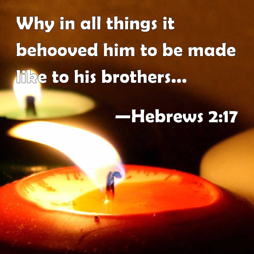 Choose a Background Hebrews 2:17 Why in all things it behooved him to be made like to his brothers, that he might be a merciful and faithful high priest in things pertaining to God, to make reconciliation for the sins of the people. KJV: Wherefore in all things it behoved him to be made like unto his brethren, that he might be a merciful and faithful high priest in things pertaining to God, to make reconciliation for the sins of the people. DRB: Wherefore it behoved him in all things to be made like unto his brethren, that he might become a merciful and faithful priest before God, that he might be a propitiation for the sins of the people. DBT: Wherefore it behoved him in all things to be made like to his brethren, that he might be a merciful and faithful high priest in things relating to God, to make propitiation for the sins of the people; ERV: Wherefore it behoved him in all things to be made like unto his brethren, that he might be a merciful and faithful high priest in things pertaining to God, to make propitiation for the sins of the people. WBT: Wherefore in all things it behooved him to be made like his brethren; that he might be a merciful and faithful High Priest in things pertaining to God, to make reconciliation for the sins of the people. WEB: Therefore he was obligated in all things to be made like his brothers, that he might become a merciful and faithful high priest in things pertaining to God, to make atonement for the sins of the people. YLT: wherefore it did behove him in all things to be made like to the brethren, that he might become a kind and stedfast chief-priest in the things with God, to make propitiation for the sins of the people,Links Hebrews 2:17 NIV • Hebrews 2:17 NLT • Hebrews 2:17 ESV • Hebrews 2:17 NASB • Hebrews 2:17 KJV • Hebrews 2:17 Interlinear • Hebrews 2:17 Commentaries • Hebrews 2:17 Parallel Texts • Hebrews 2:17 Bible Apps • Hebrews 2:17 Parallel • Bible Hub |