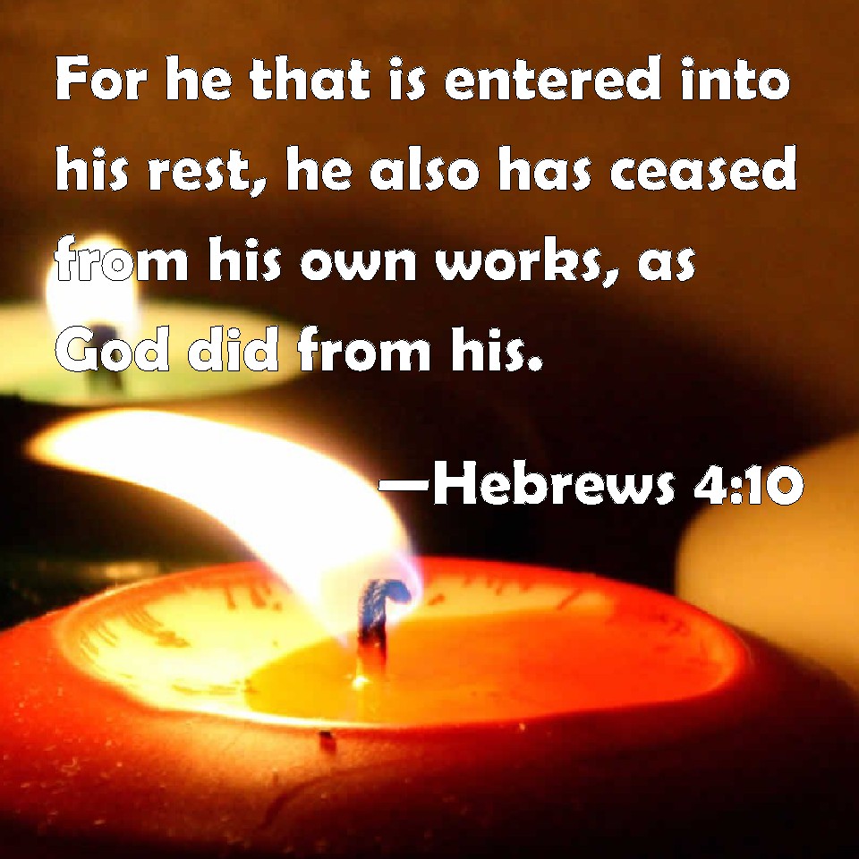 Choose a Background Hebrews 4:10 For he that is entered into his rest, he also has ceased from his own works, as God did from his. KJV: For he that is entered into his rest, he also hath ceased from his own works, as God did from his. DRB: For he that is entered into his rest, the same also hath rested from his works, as God did from his. DBT: For he that has entered into his rest, he also has rested from his works, as God did from his own. ERV: For he that is entered into his rest hath himself also rested from his works, as God did from his. WBT: For he that hath entered into his rest, he also hath ceased from his own works, as God did from his.) WEB: For he who has entered into his rest has himself also rested from his works, as God did from his. YLT: for he who did enter into his rest, he also rested from his works, as God from His own.Links Hebrews 4:10 NIV • Hebrews 4:10 NLT • Hebrews 4:10 ESV • Hebrews 4:10 NASB • Hebrews 4:10 KJV • Hebrews 4:10 Interlinear • Hebrews 4:10 Commentaries • Hebrews 4:10 Parallel Texts • Hebrews 4:10 Bible Apps • Hebrews 4:10 Parallel • Bible Hub |