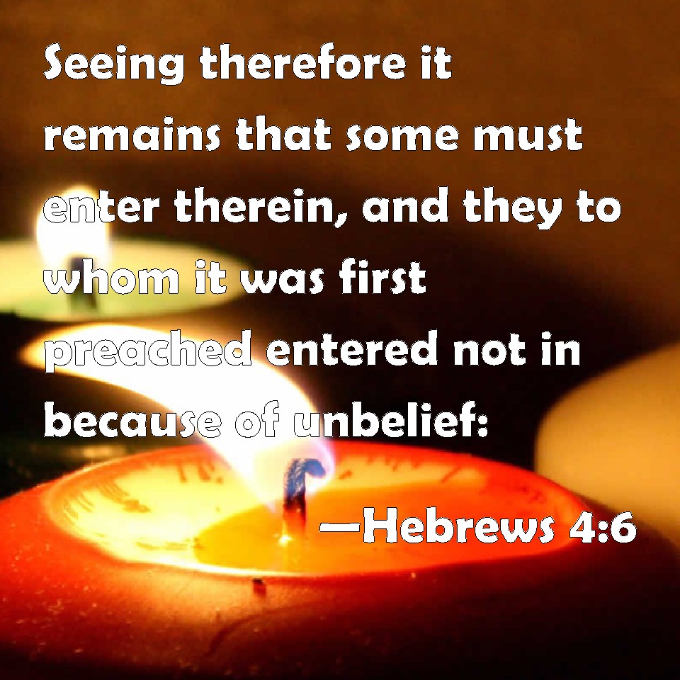 Choose a Background Hebrews 4:6 Seeing therefore it remains that some must enter therein, and they to whom it was first preached entered not in because of unbelief: KJV: Seeing therefore it remaineth that some must enter therein, and they to whom it was first preached entered not in because of unbelief: DRB: Seeing then it remaineth that some are to enter into it, and they, to whom it was first preached, did not enter because of unbelief: DBT: Seeing therefore it remains that some enter into it, and those who first received the glad tidings did not enter in on account of not hearkening to the word, ERV: Seeing therefore it remaineth that some should enter thereinto, and they to whom the good tidings were before preached failed to enter in because of disobedience, WBT: Seeing therefore it remaineth that some must enter into it, and they to whom it was first preached entered not because of unbelief: WEB: Seeing therefore it remains that some should enter therein, and they to whom the good news was before preached failed to enter in because of disobedience, YLT: since then, it remaineth for certain to enter into it, and those who did first hear good news entered not in because of unbelief — Links Hebrews 4:6 NIV • Hebrews 4:6 NLT • Hebrews 4:6 ESV • Hebrews 4:6 NASB • Hebrews 4:6 KJV • Hebrews 4:6 Interlinear • Hebrews 4:6 Commentaries • Hebrews 4:6 Parallel Texts • Hebrews 4:6 Bible Apps • Hebrews 4:6 Parallel • Bible Hub |