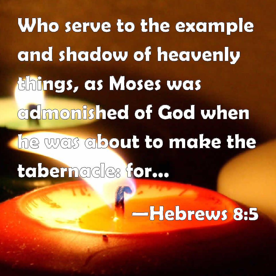 Choose a Background Hebrews 8:5 Who serve to the example and shadow of heavenly things, as Moses was admonished of God when he was about to make the tabernacle: for, See, said he, that you make all things according to the pattern showed to you in the mount. KJV: Who serve unto the example and shadow of heavenly things, as Moses was admonished of God when he was about to make the tabernacle: for, See, saith he, that thou make all things according to the pattern shewed to thee in the mount. DRB: Who serve unto the example and shadow of heavenly things. As it was answered to Moses, when he was to finish the tabernacle: See (saith he) that thou make all things according to the pattern which was shewn thee on the mount. DBT: (who serve the representation and shadow of heavenly things, according as Moses was oracularly told when about to make the tabernacle; for See, saith He, that thou make all things according to the pattern which has been shewn to thee in the mountain.) ERV: who serve that which is a copy and shadow of the heavenly things, even as Moses is warned of God when he is about to make the tabernacle: for, See, saith he, that thou make all things according to the pattern that was shewed thee in the mount. WBT: Who serve to the example and shadow of heavenly things, as Moses was admonished by God when he was about to make the tabernacle: for, See (saith he) that thou make all things according to the pattern shown to thee in the mount. WEB: who serve a copy and shadow of the heavenly things, even as Moses was warned by God when he was about to make the tabernacle, for he said, "See, you shall make everything according to the pattern that was shown to you on the mountain." YLT: who unto an example and shadow do serve of the heavenly things, as Moses hath been divinely warned, being about to construct the tabernacle, for 'See (saith He) thou mayest make all things according to the pattern that was shewn to thee in the mount;') — Links Hebrews 8:5 NIV • Hebrews 8:5 NLT • Hebrews 8:5 ESV • Hebrews 8:5 NASB • Hebrews 8:5 KJV • Hebrews 8:5 Interlinear • Hebrews 8:5 Commentaries • Hebrews 8:5 Parallel Texts • Hebrews 8:5 Bible Apps • Hebrews 8:5 Parallel • Bible Hub |