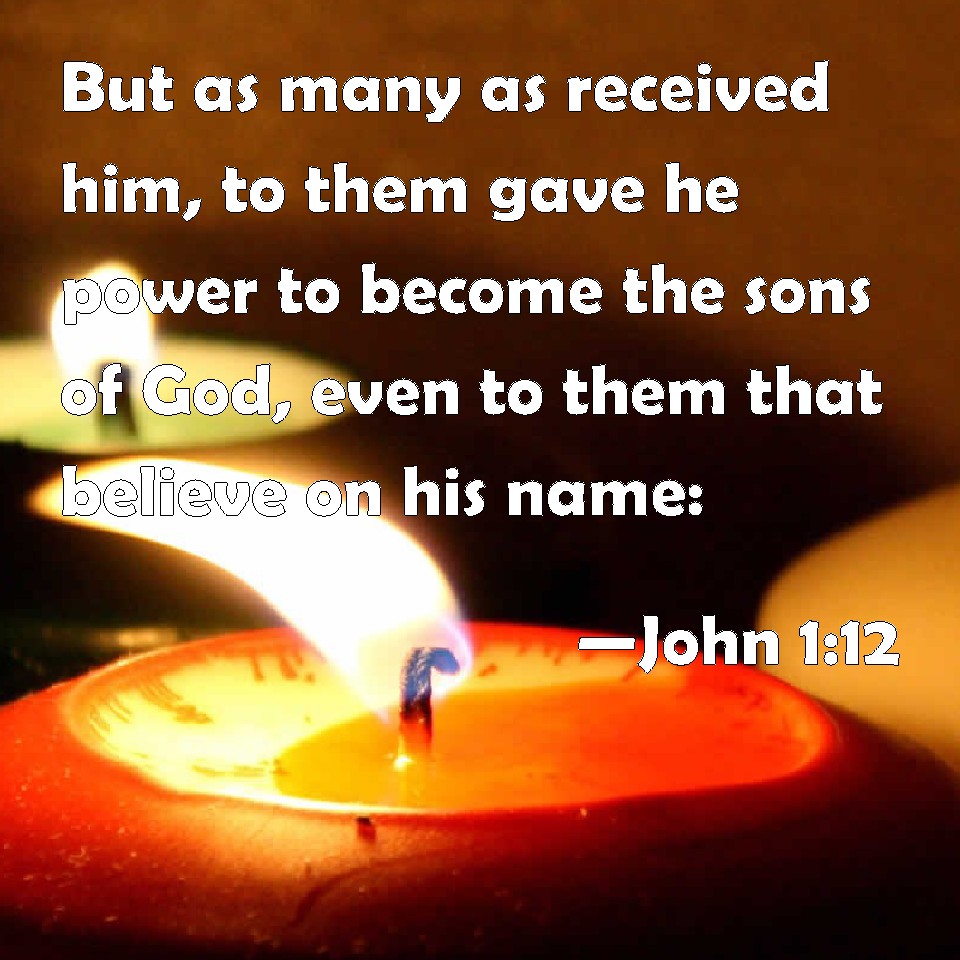 Choose a Background John 1:12 But as many as received him, to them gave he power to become the sons of God, even to them that believe on his name: KJV: But as many as received him, to them gave he power to become the sons of God, even to them that believe on his name: DRB: But as many as received him, he gave them power to be made the sons of God, to them that believe in his name. DBT: but as many as received him, to them gave he the right to be children of God, to those that believe on his name; ERV: But as many as received him, to them gave he the right to become children of God, even to them that believe on his name: WBT: But as many as received him, to them he gave power to become the sons of God, even to them that believe on his name: WEB: But as many as received him, to them he gave the right to become God's children, to those who believe in his name: YLT: but as many as did receive him to them he gave authority to become sons of God — to those believing in his name,Links John 1:12 NIV • John 1:12 NLT • John 1:12 ESV • John 1:12 NASB • John 1:12 KJV • John 1:12 Interlinear • John 1:12 Commentaries • John 1:12 Parallel Texts • John 1:12 Bible Apps • John 1:12 Parallel • Bible Hub |