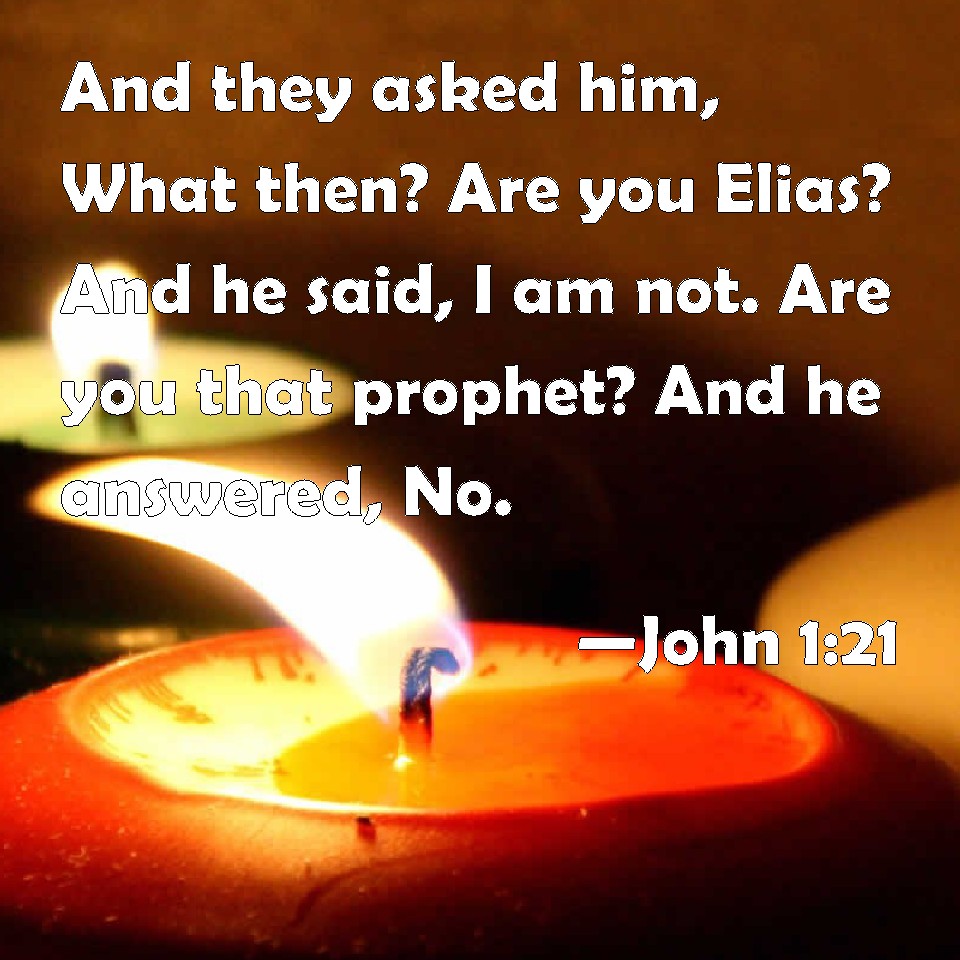 Choose a Background John 1:21 And they asked him, What then? Are you Elias? And he said, I am not. Are you that prophet? And he answered, No. KJV: And they asked him, What then? Art thou Elias? And he saith, I am not. Art thou that prophet? And he answered, No. DRB: And they asked him: What then? Art thou Elias? And he said: I am not. Art thou the prophet? And he answered: No. DBT: And they asked him, What then? Art thou Elias? And he says, I am not. Art thou the prophet? And he answered, No. ERV: And they asked him, What then? Art thou Elijah? And he saith, I am not. Art thou the prophet? And he answered, No. WBT: And they asked him, What then? Art thou Elijah? and he saith, I am not. Art thou that prophet? And he answered, No. WEB: They asked him, "What then? Are you Elijah?" He said, "I am not." "Are you the prophet?" He answered, "No." YLT: And they questioned him, 'What then? Elijah art thou?' and he saith, 'I am not.' — 'The prophet art thou?' and he answered, 'No.'Links John 1:21 NIV • John 1:21 NLT • John 1:21 ESV • John 1:21 NASB • John 1:21 KJV • John 1:21 Interlinear • John 1:21 Commentaries • John 1:21 Parallel Texts • John 1:21 Bible Apps • John 1:21 Parallel • Bible Hub |