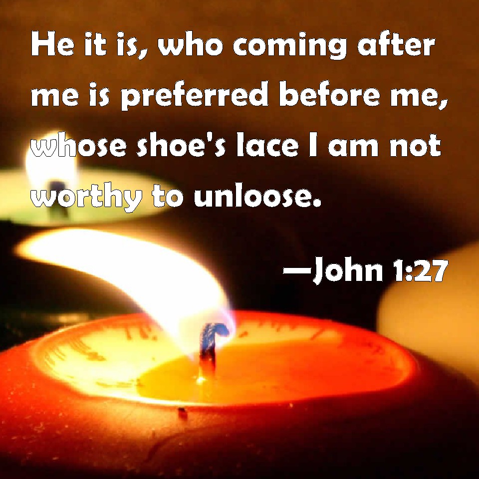 Choose a Background John 1:27 He it is, who coming after me is preferred before me, whose shoe's lace I am not worthy to unloose. KJV: He it is, who coming after me is preferred before me, whose shoe's latchet I am not worthy to unloose. DRB: The same is he that shall come after me, who is preferred before me: the latchet of whose shoe I am not worthy to loose. DBT: he who comes after me, the thong of whose sandal I am not worthy to unloose. ERV: even he that cometh after me, the latchet of whose shoe I am not worthy to unloose. WBT: He it is, who coming after me, is preferred before me, whose shoes' latchet I am not worthy to unloose. WEB: He is the one who comes after me, who is preferred before me, whose sandal strap I'm not worthy to loosen." YLT: of whom I am not worthy that I may loose the cord of his sandal.'Links John 1:27 NIV • John 1:27 NLT • John 1:27 ESV • John 1:27 NASB • John 1:27 KJV • John 1:27 Interlinear • John 1:27 Commentaries • John 1:27 Parallel Texts • John 1:27 Bible Apps • John 1:27 Parallel • Bible Hub |