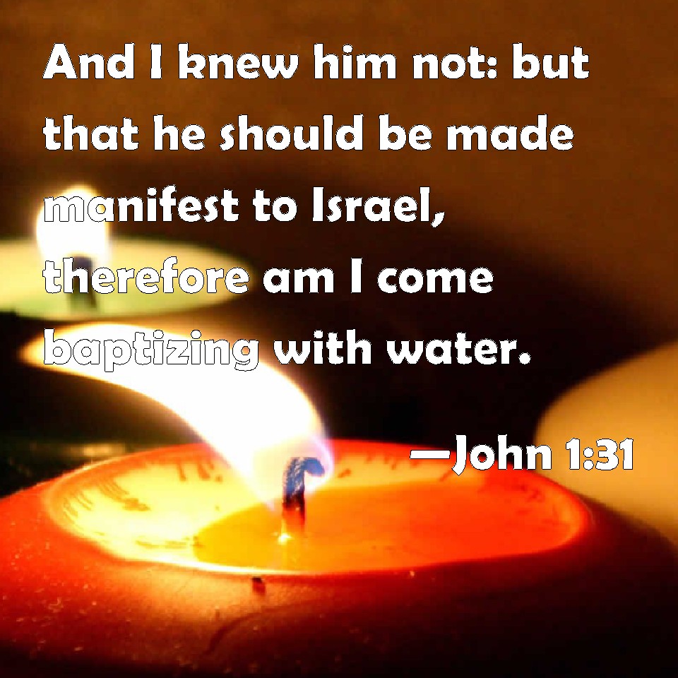 Choose a Background John 1:31 And I knew him not: but that he should be made manifest to Israel, therefore am I come baptizing with water. KJV: And I knew him not: but that he should be made manifest to Israel, therefore am I come baptizing with water. DRB: And I knew him not, but that he may be made manifest in Israel, therefore am I come baptizing with water. DBT: and I knew him not; but that he might be manifested to Israel, therefore have I come baptising with water. ERV: And I knew him not; but that he should be made manifest to Israel, for this cause came I baptizing with water. WBT: And I knew him not: but that he should be made manifest to Israel, therefore am I come baptizing with water. WEB: I didn't know him, but for this reason I came baptizing in water: that he would be revealed to Israel." YLT: and I knew him not, but, that he might be manifested to Israel, because of this I came with the water baptizing.Links John 1:31 NIV • John 1:31 NLT • John 1:31 ESV • John 1:31 NASB • John 1:31 KJV • John 1:31 Interlinear • John 1:31 Commentaries • John 1:31 Parallel Texts • John 1:31 Bible Apps • John 1:31 Parallel • Bible Hub |