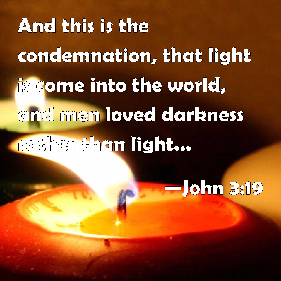 Choose a Background John 3:19 And this is the condemnation, that light is come into the world, and men loved darkness rather than light, because their deeds were evil. KJV: And this is the condemnation, that light is come into the world, and men loved darkness rather than light, because their deeds were evil. DRB: And this is the judgment: because the light is come into the world, and men loved darkness rather than the light: for their works were evil. DBT: And this is the judgment, that light is come into the world, and men have loved darkness rather than light; for their works were evil. ERV: And this is the judgment, that the light is come into the world, and men loved the darkness rather than the light; for their works were evil. WBT: And this is the condemnation, that light is come into the world, and men have loved darkness rather than light, because their deeds were evil. WEB: This is the judgment, that the light has come into the world, and men loved the darkness rather than the light; for their works were evil. YLT: 'And this is the judgment, that the light hath come to the world, and men did love the darkness rather than the light, for their works were evil;Links John 3:19 NIV • John 3:19 NLT • John 3:19 ESV • John 3:19 NASB • John 3:19 KJV • John 3:19 Interlinear • John 3:19 Commentaries • John 3:19 Parallel Texts • John 3:19 Bible Apps • John 3:19 Parallel • Bible Hub |