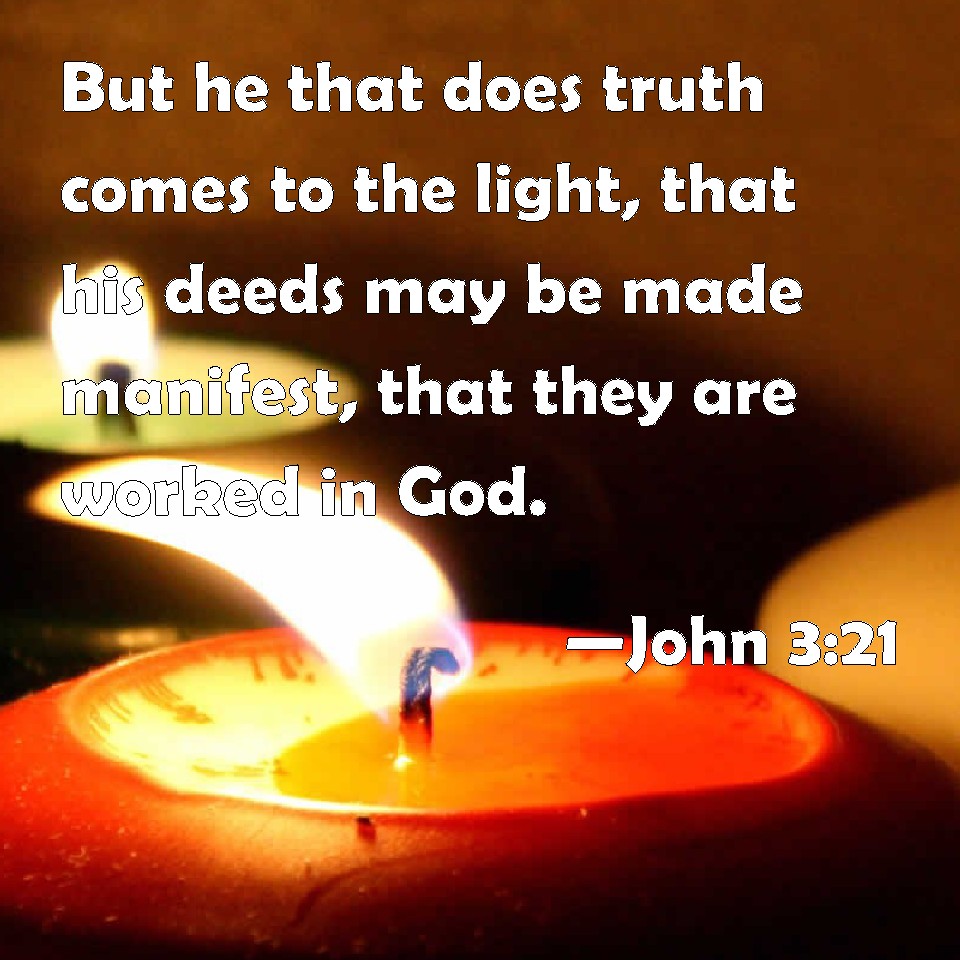 Choose a Background John 3:21 But he that does truth comes to the light, that his deeds may be made manifest, that they are worked in God. KJV: But he that doeth truth cometh to the light, that his deeds may be made manifest, that they are wrought in God. DRB: But he that doth truth, cometh to the light, that his works may be made manifest, because they are done in God. DBT: but he that practises the truth comes to the light, that his works may be manifested that they have been wrought in God. ERV: But he that doeth the truth cometh to the light, that his works may be made manifest, that they have been wrought in God. WBT: But he that doeth truth, cometh to the light, that his deeds may be made manifest, that they are wrought in God. WEB: But he who does the truth comes to the light, that his works may be revealed, that they have been done in God." YLT: but he who is doing the truth doth come to the light, that his works may be manifested, that in God they are having been wrought.'Links John 3:21 NIV • John 3:21 NLT • John 3:21 ESV • John 3:21 NASB • John 3:21 KJV • John 3:21 Interlinear • John 3:21 Commentaries • John 3:21 Parallel Texts • John 3:21 Bible Apps • John 3:21 Parallel • Bible Hub |